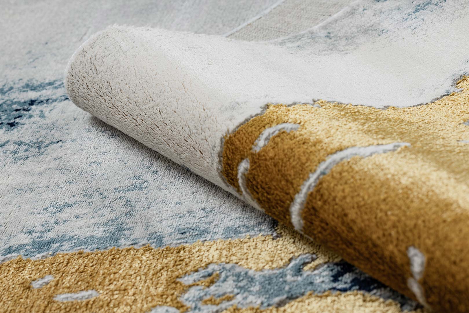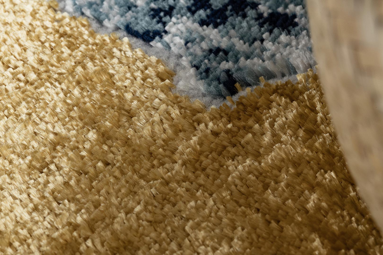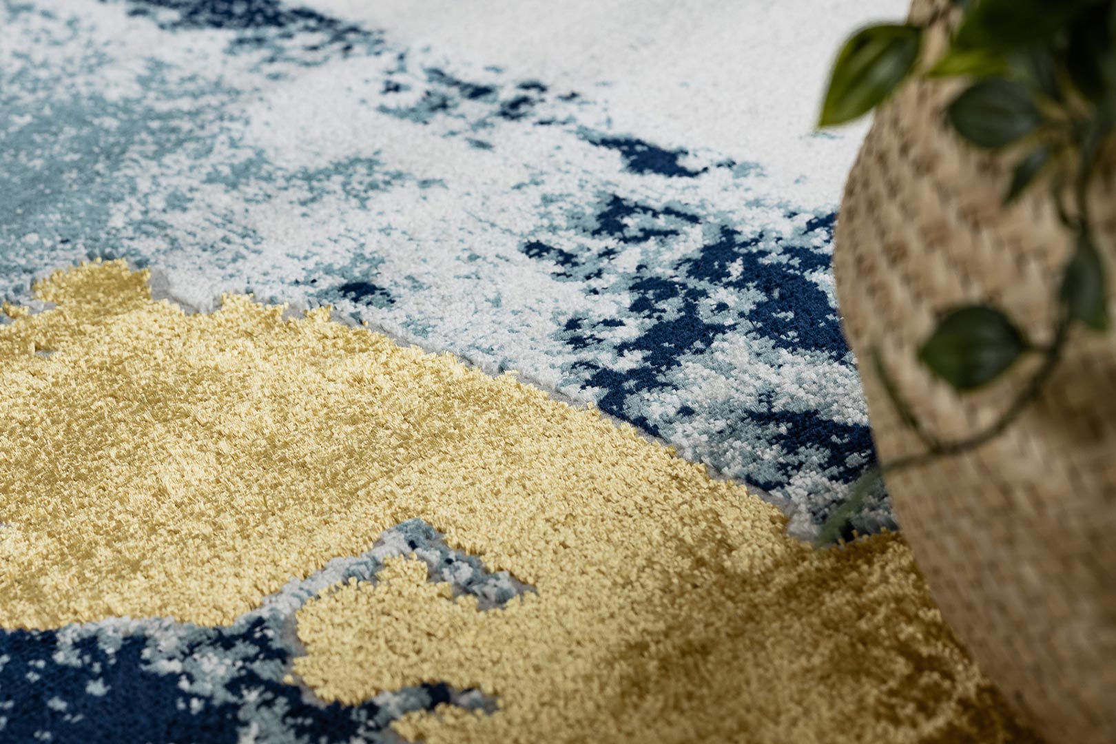 Artystyczny dywan glamour, niebieski, złoty, żółty, kolorowe pociągnięcia pędzlem, styl nowoczesny oraz vintage