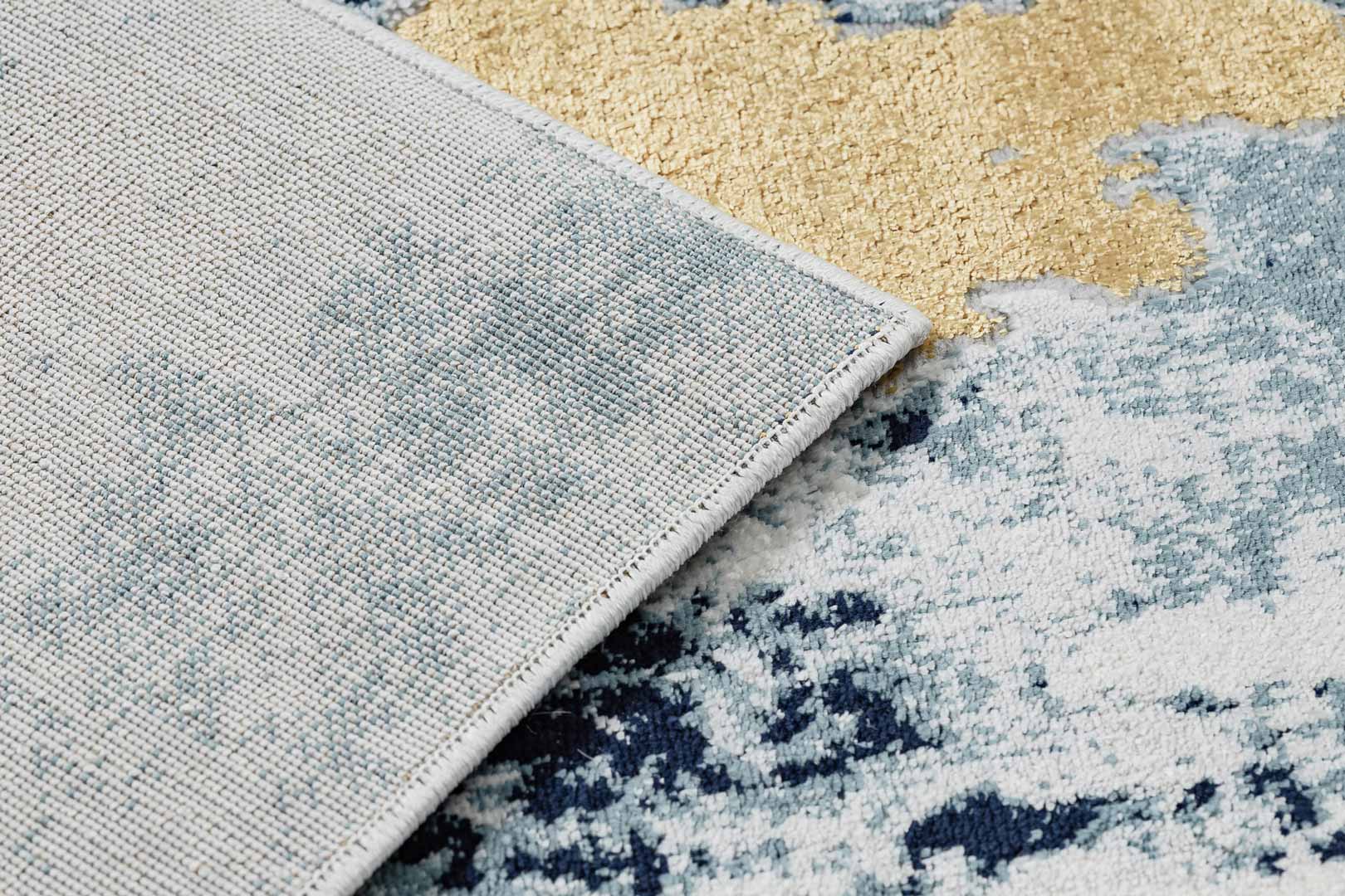 Ten artystyczny, abstrakcyjny dywan w kolorowe, niebieskie i złote/żółte pociągnięcia pędzlem na wspaniale kontrastującym jasnym tle to kompozycja, która wręcz idealnie sprawdzi się w jasnych, nowoczesnych wnętrzach. Ten nieszablonowy wzór pasuje jednak również do wnętrz urządzonych efektownym stylu glamour lub boho, vintage i retro. Materiał, z którego jest wykonany zapewnia zachowanie kolorów, sprężystość oraz łatwość w czyszczeniu!
