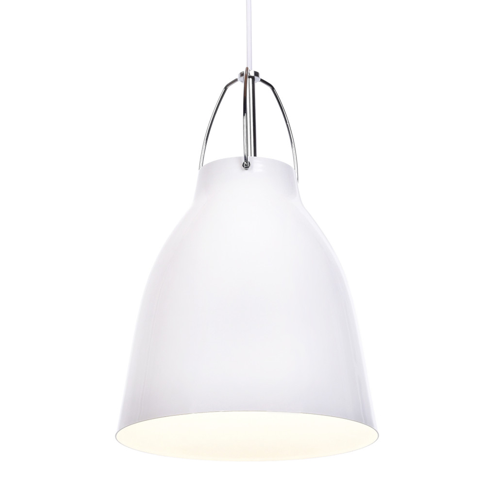 Biała, nowoczesna lampa skandynawska loft RAYO wisząca z metalowym kloszem. Pasuje zarówno do stylu skandynawskiego jak i loftowego, industrialnego.
