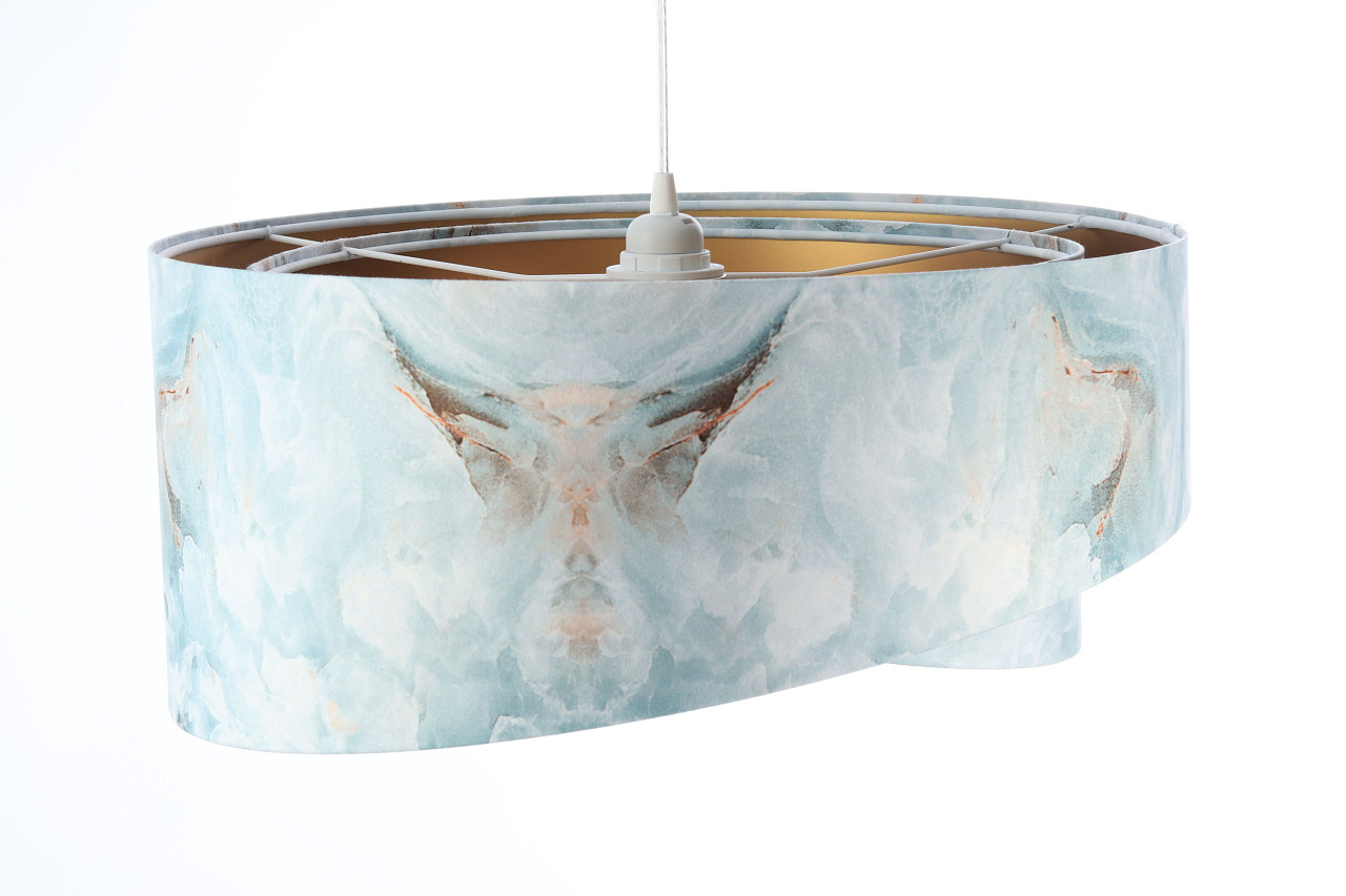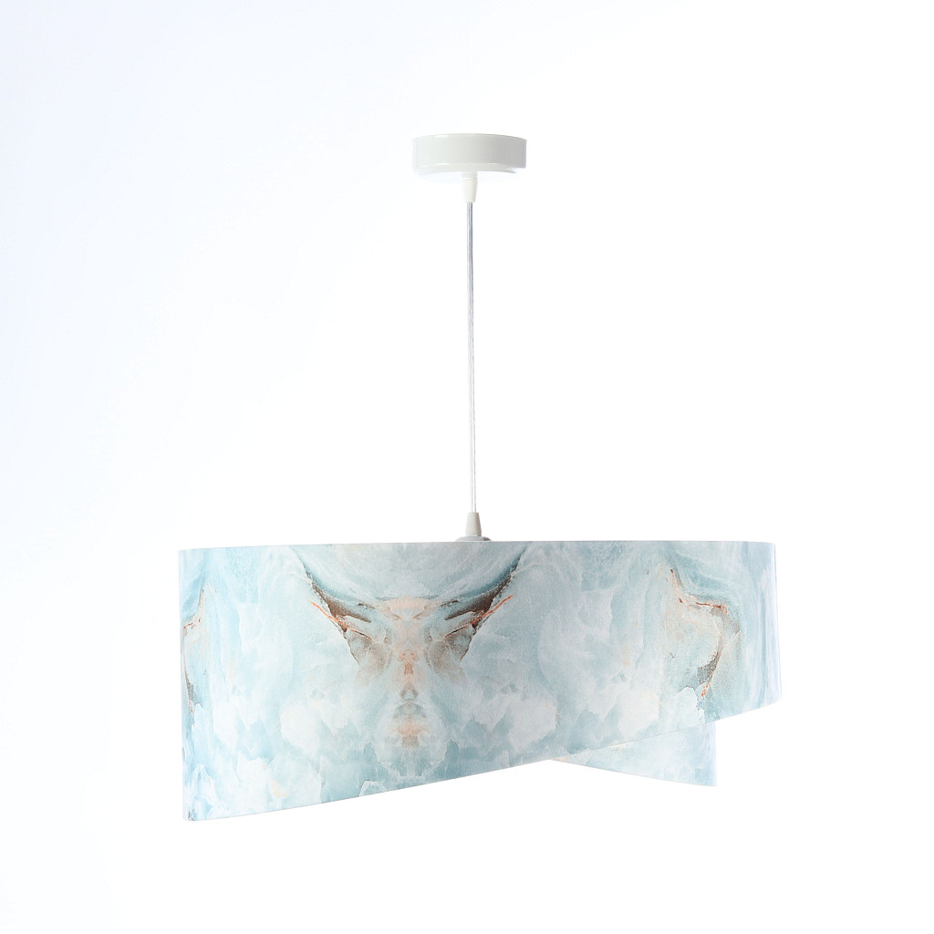 Błękitno-biała lampa wisząca z welurowym, asymetrycznym kloszem w artystyczny wzór ICE
