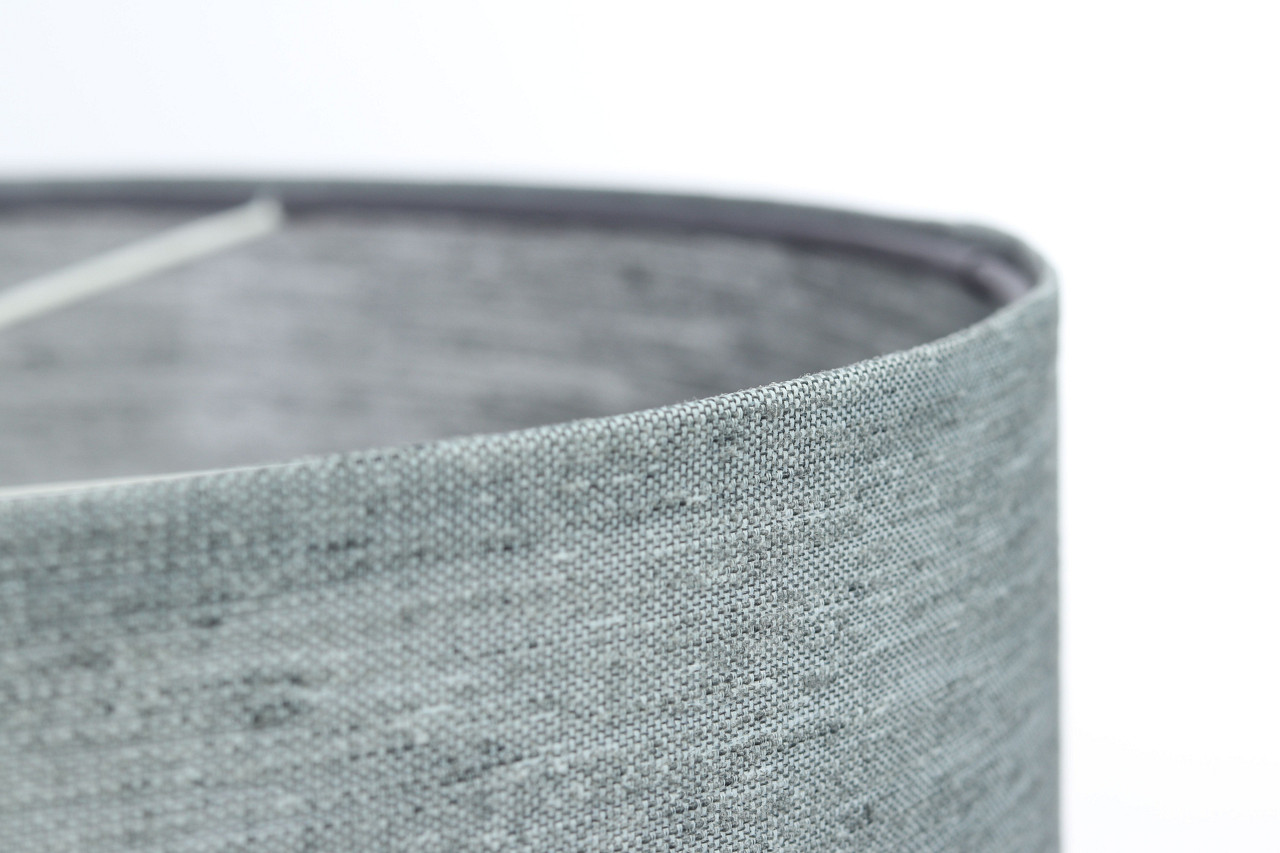 Szara lampa sufitowa, plafon w kształcie walca z abażurem z tkaniny o lnianej strukturze MURII