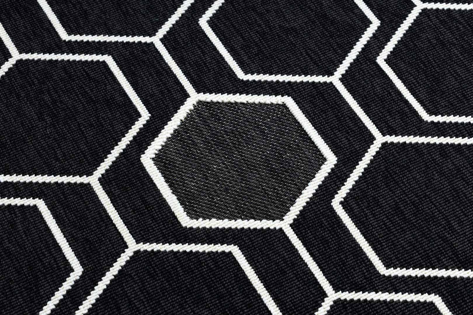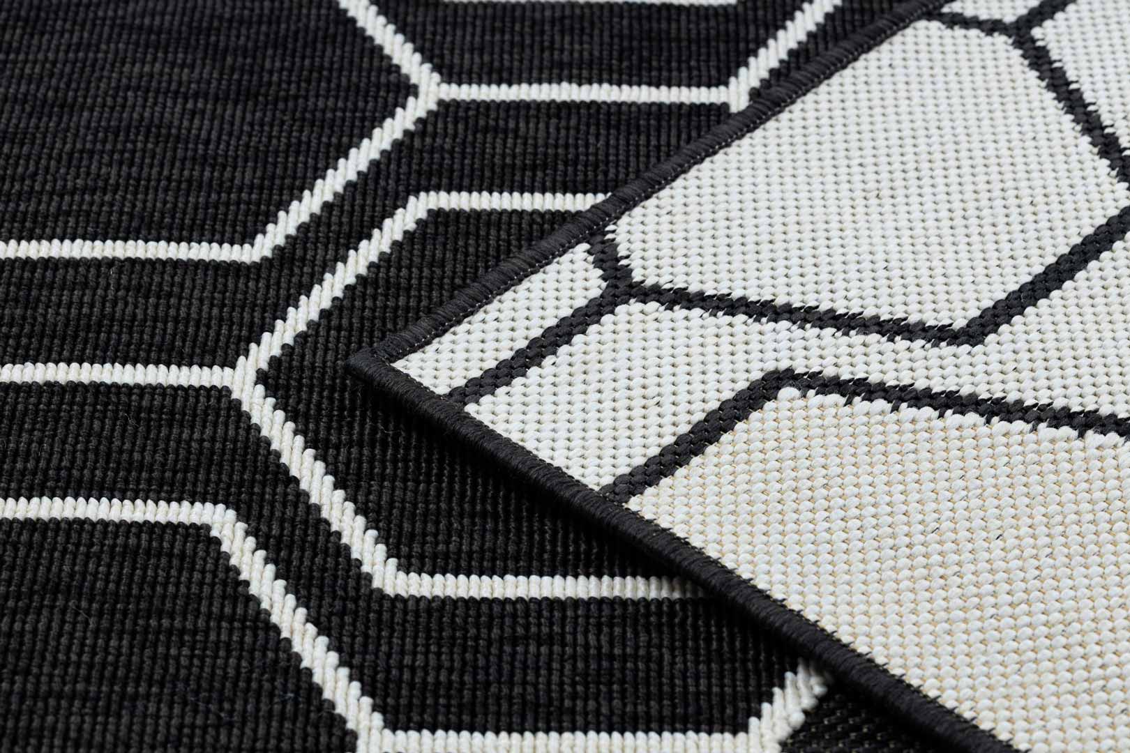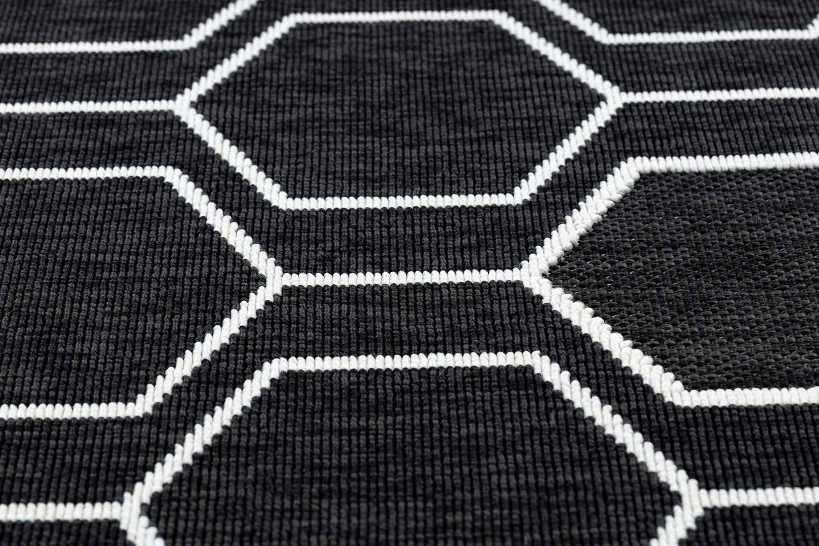 Ten czarny dywan w geometryczny wzór heksagony w białej barwie będzie bardzo atrakcyjnym dodatkiem do biura lub domowego, loftowego czy skandynawskiego wnętrza, które potrzebuje odświeżenia. Materiał, użyty do produkcji tego produktu umożliwia używanie go również na zewnątrz - na balkonach czy tarasach. Dodatkowo, również dzięki sznurkowo-pętelkowej technice wykonania, tworzy barierę dla wody, brudu, sierści zwierząt oraz oferuje łatwość w usuwaniu zabrudzeń. Gwarantuje zatem trwałość na długie lata.