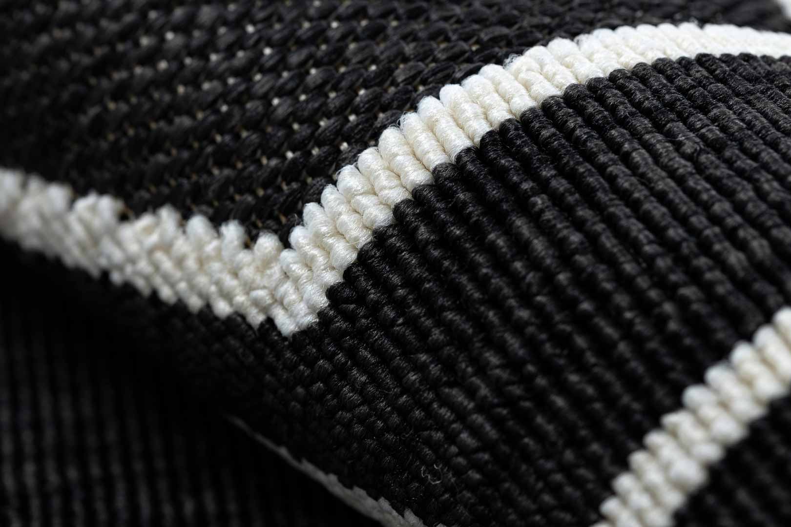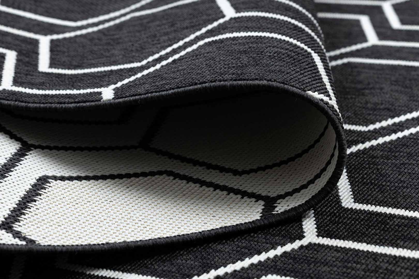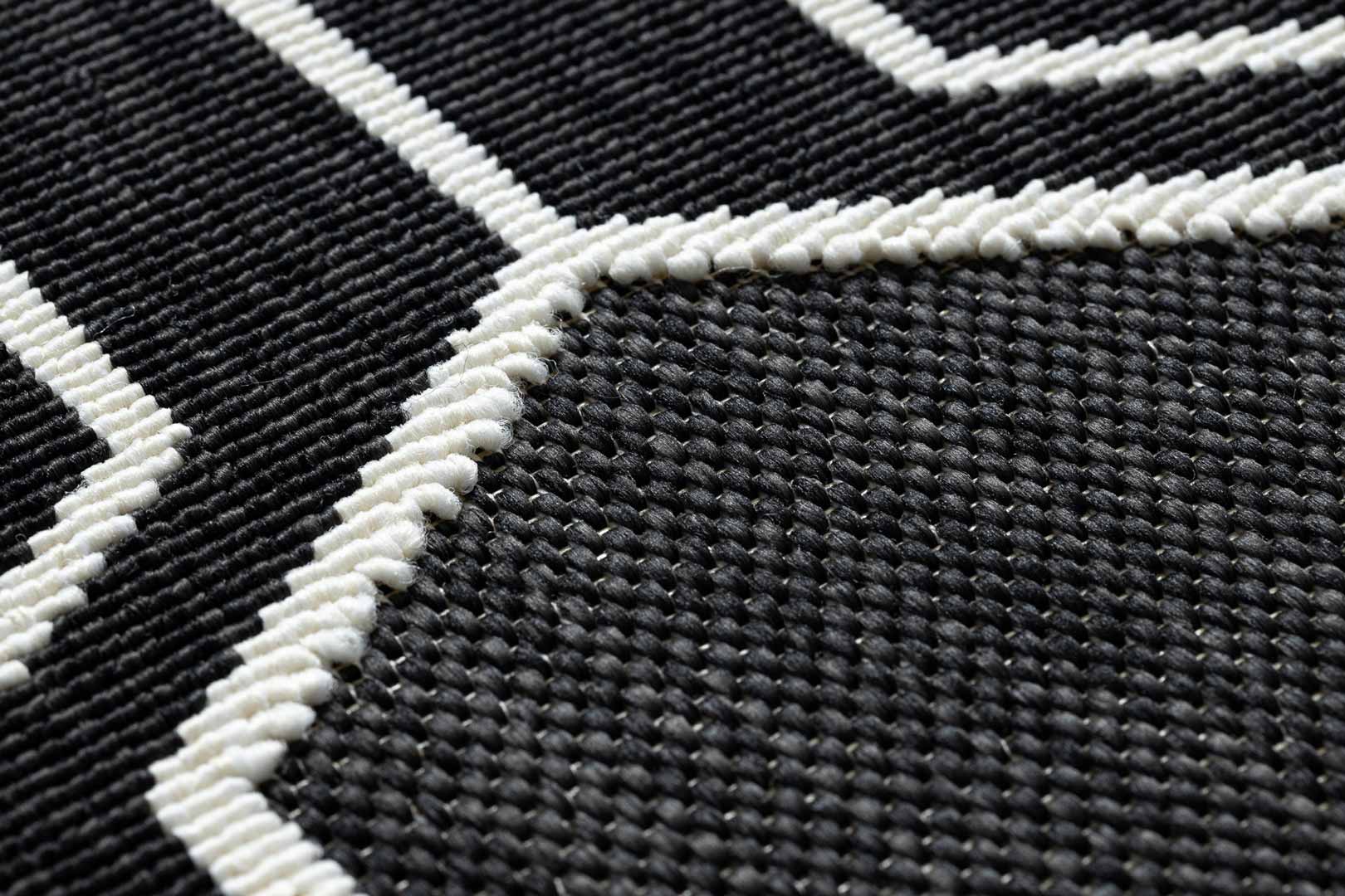 Ten czarny dywan w geometryczny wzór heksagony w białej barwie będzie bardzo atrakcyjnym dodatkiem do biura lub domowego, loftowego czy skandynawskiego wnętrza, które potrzebuje odświeżenia. Materiał, użyty do produkcji tego produktu umożliwia używanie go również na zewnątrz - na balkonach czy tarasach. Dodatkowo, również dzięki sznurkowo-pętelkowej technice wykonania, tworzy barierę dla wody, brudu, sierści zwierząt oraz oferuje łatwość w usuwaniu zabrudzeń. Gwarantuje zatem trwałość na długie lata.