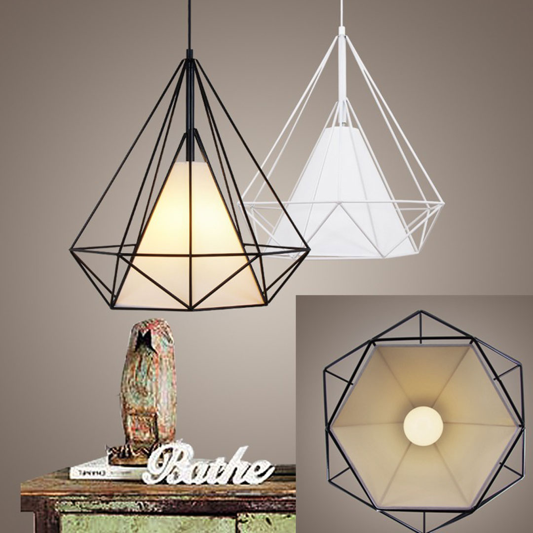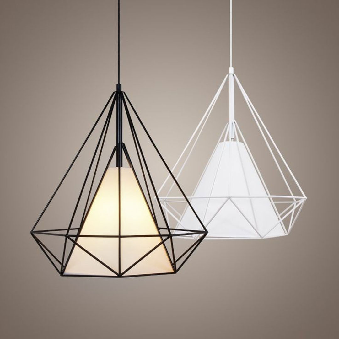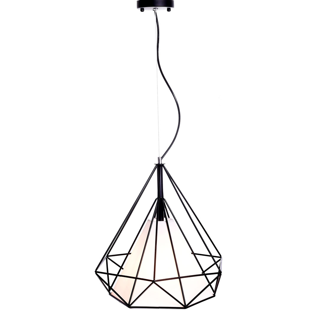 Minimalistyczna, wisząca lampa druciana czarna w kształcie diamentu pasująca do stylu industrialnego, loft a także skandynawskiego. Klosz metalowy z drutu oraz abażurek z białej tkaniny.