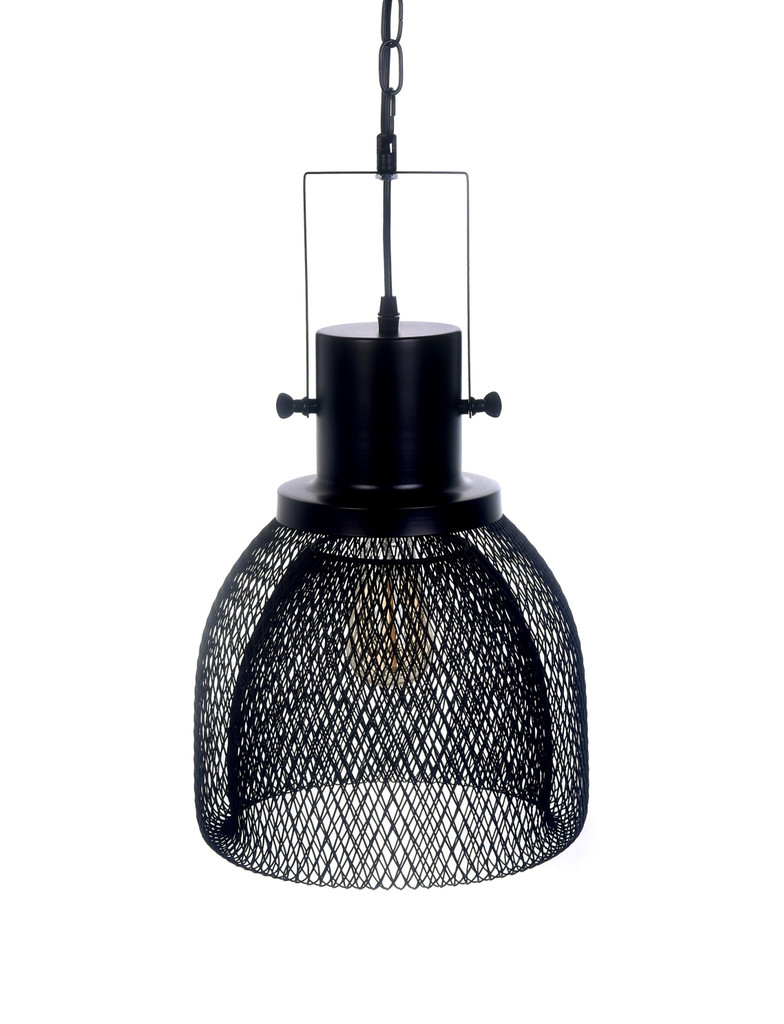 Industrialna lampa wisząca FRATTON na łańcuchu z półokrągłym czarnym kloszem z metalowej siateczki. Lampa jest w nowoczesnym, industrialnym stylu. Świetnie będzie wyglądała w kuchni, jadalni, przedpokoju oraz w lokalach.