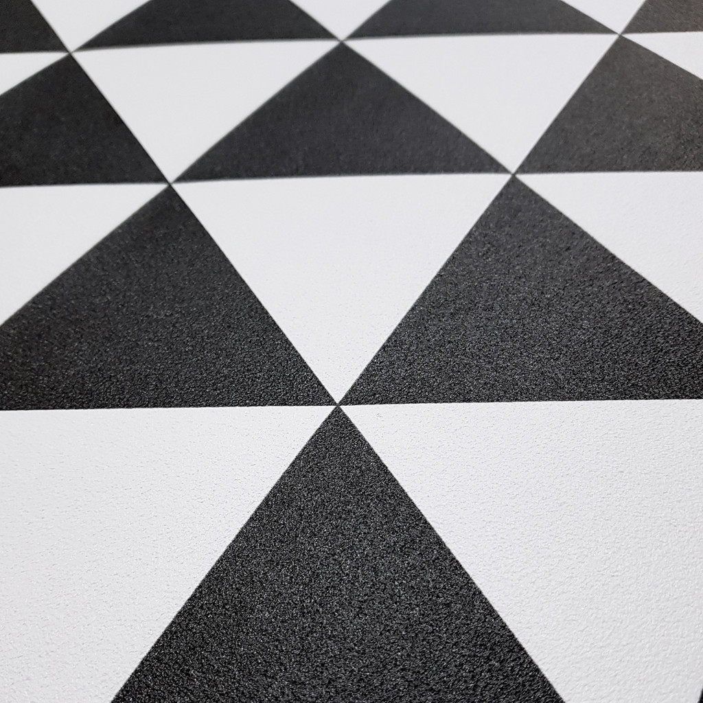 Czarno biała tapeta w trójkąty równoboczne. Nowoczesna, dekoracyjna tapeta ścienna we wzór złożony z figur geometrycznych.