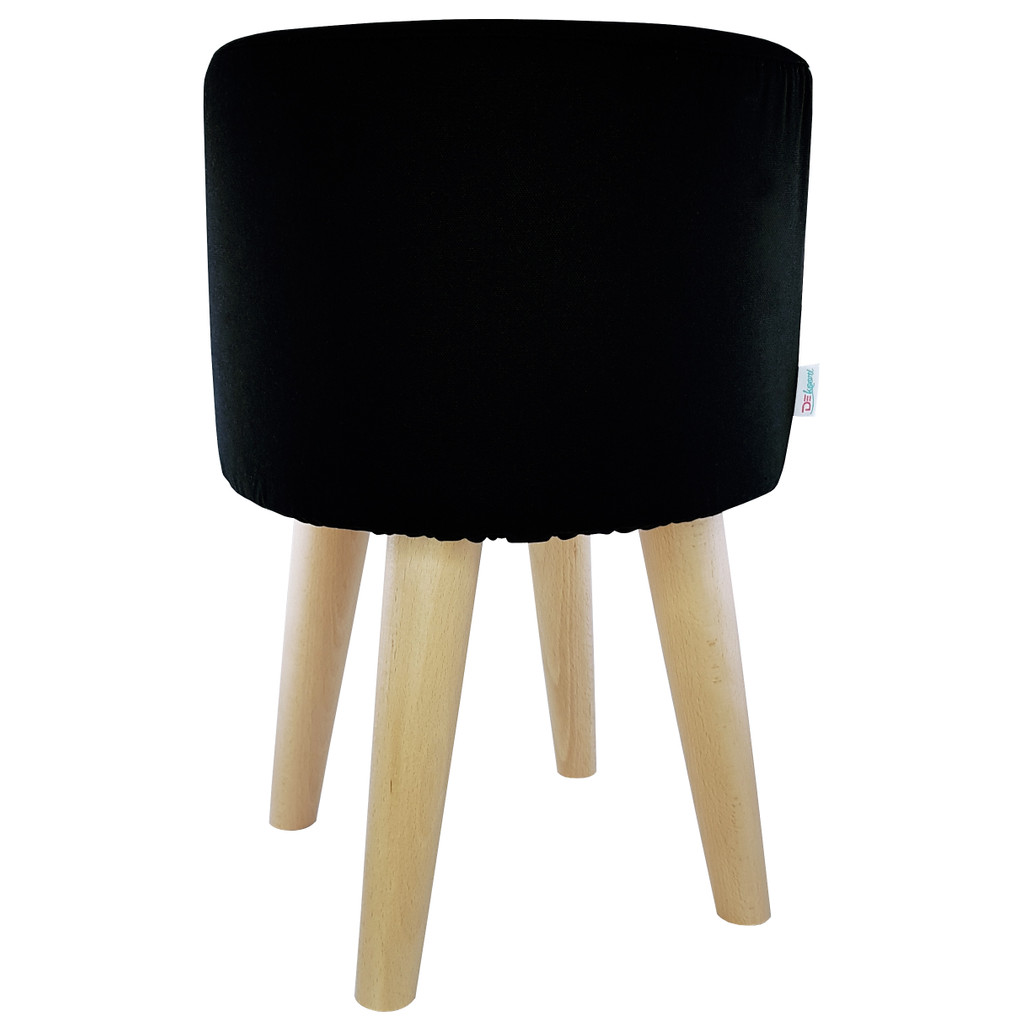Elegancki czarny puf, taboret do siedzenia. Posiada drewniane nóżki, wygodne, okrągłe siedzisko i zdejmowany, gładki, jednolity pokrowiec w czarnym kolorze. Pasuje do salonu, sypialni lub innych pomieszczeń. Do wyboru stołek niski lub wysoki z naturalnymi bukowymi nogami.
