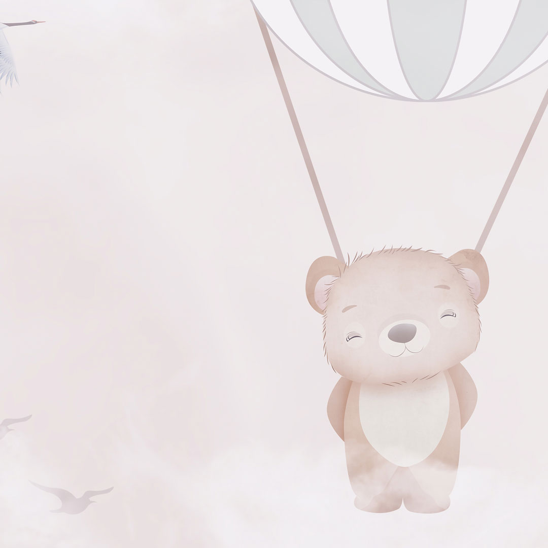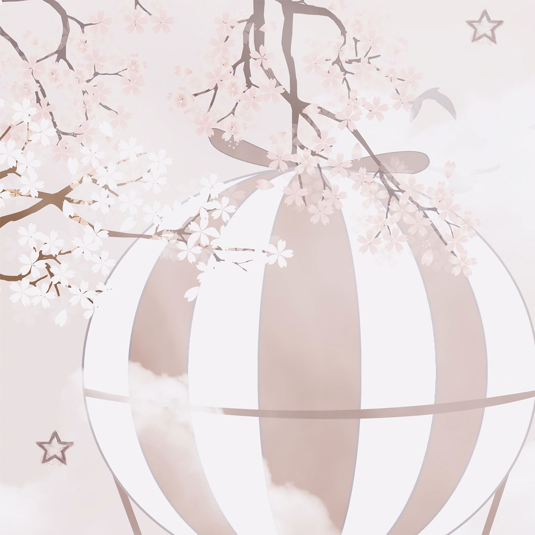 Delikatna, beżowa fototapeta do pokoju dziecięcego WYCIECZKA BALONOWA ZWIERZĘCYCH PRZYJACIÓŁ. Zwierzątka - słonik, miś, panda - wybrały się na podniebną wycieczkę balonami. Na niebie widoczne są latające ptaszki, gwiazdki a w tle drzewo i kwiat wiśni. Dominują pastelowe odcienie beżowego i brązowego koloru.
