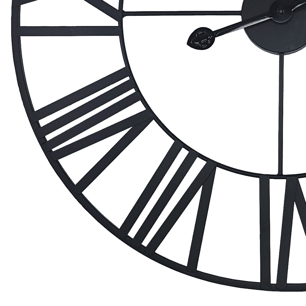 Efektowna dekoracja pasująca do wnętrz urządzonych w stylu loft lub retro / vintage. Doskonale jednak komponuje się z każdym wnętrzem. Duży zegar ścienny z rzymskimi cyframi, wykonany z metalu i wykończony w czarnym kolorze.