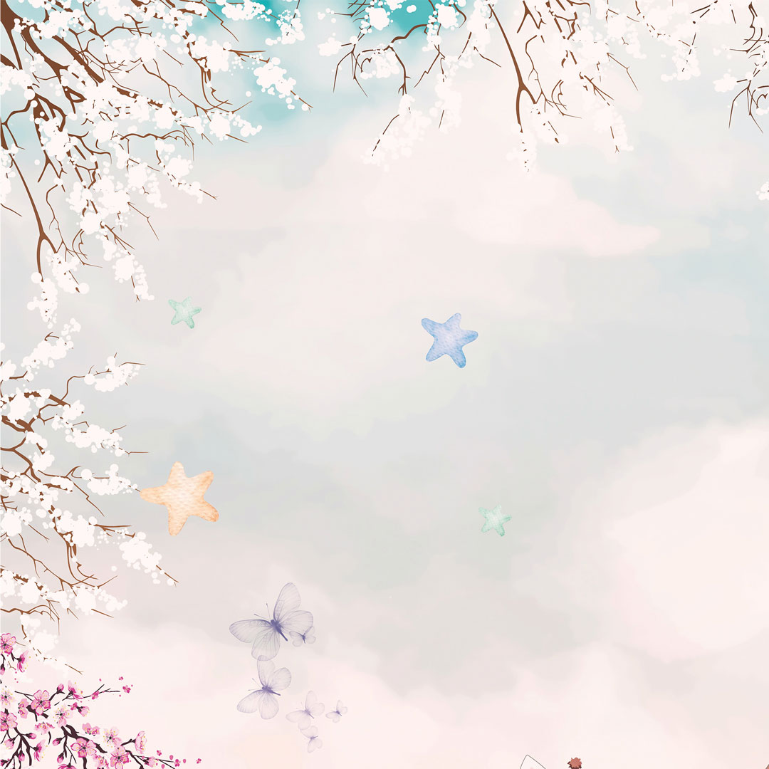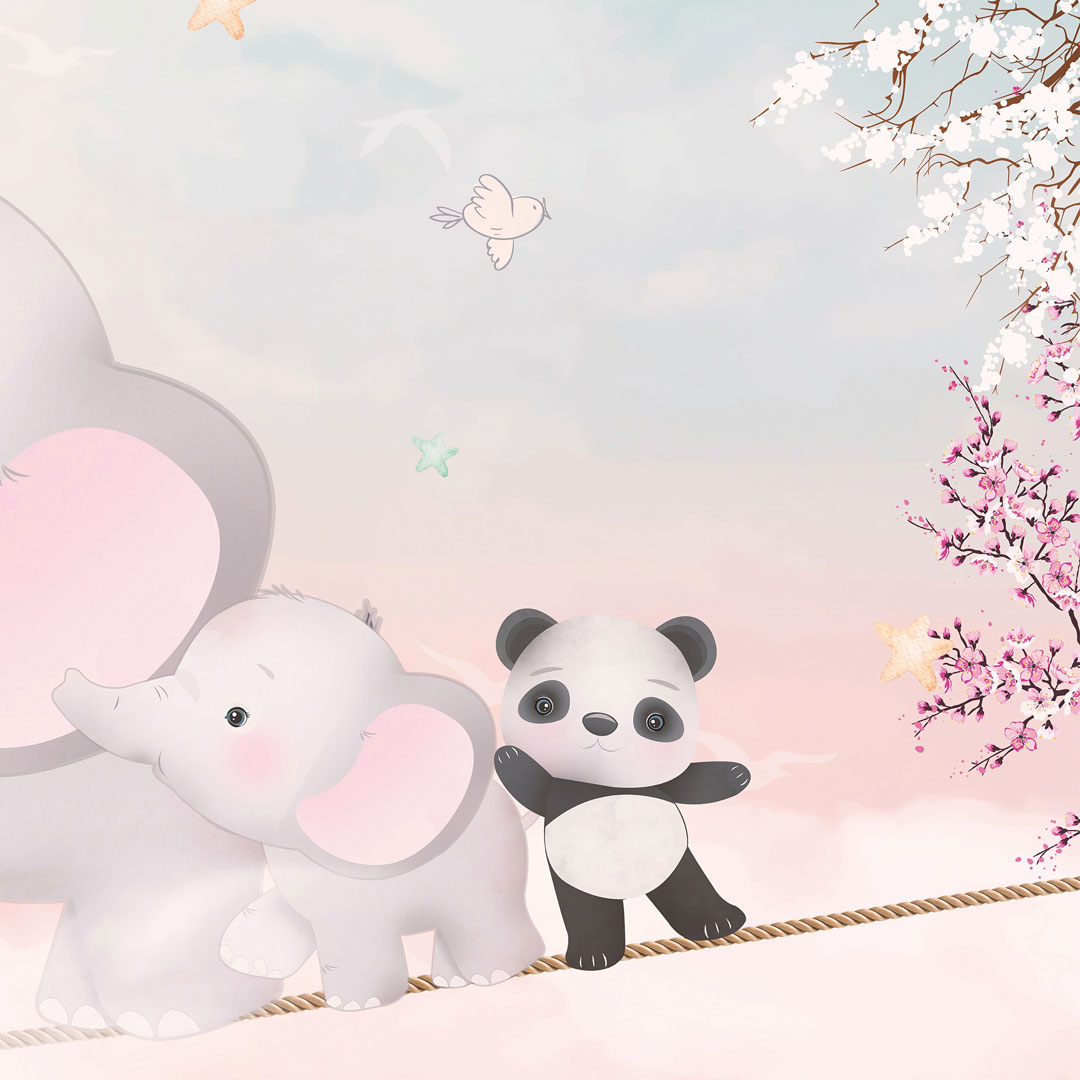 Słodka dziecięca fototapeta - spacer po linie. Nasze zwierzątka: żyrafa, panda, niedźwiadek, słonik wykonują cyrkowe sztuczki w obłokach na niebieskim niebie. Scenę uzupełniają: kwiat wiśni, kwiatki, gwiazdki, ptaszki i motylki. Zastosowano pastelowe odcienie niebieskiej, różowej i łososiowej barwy.