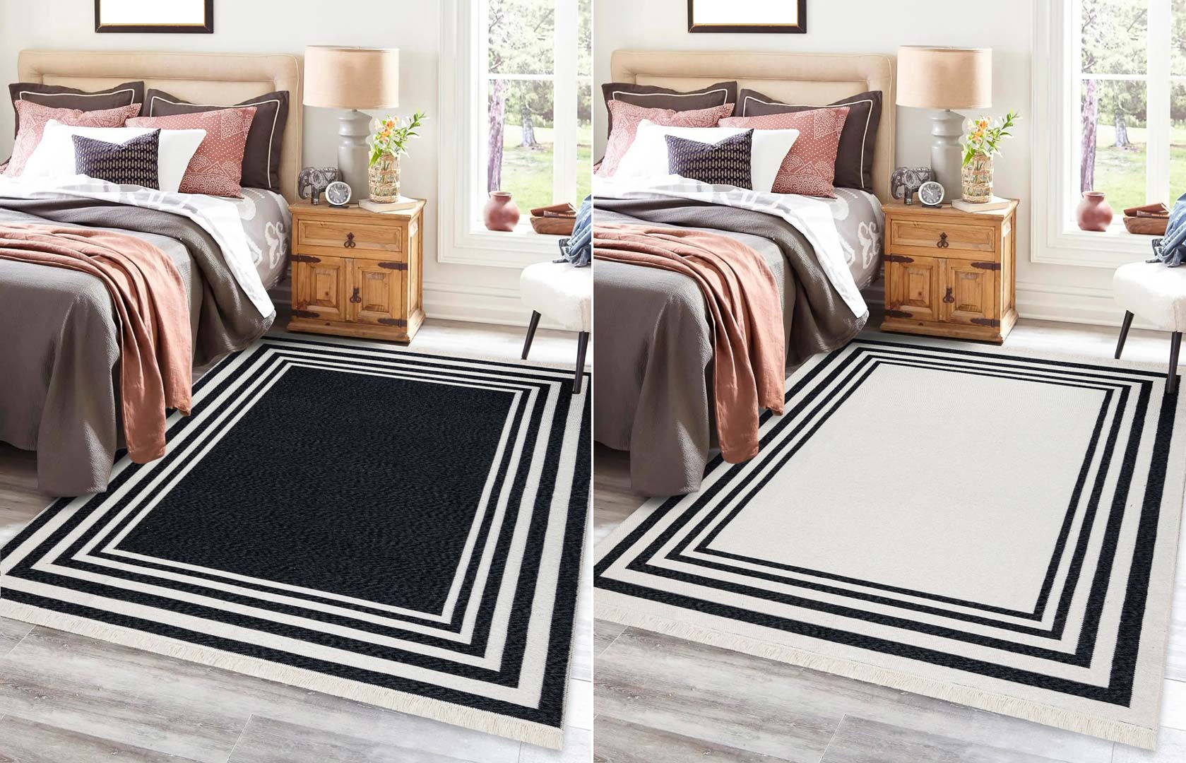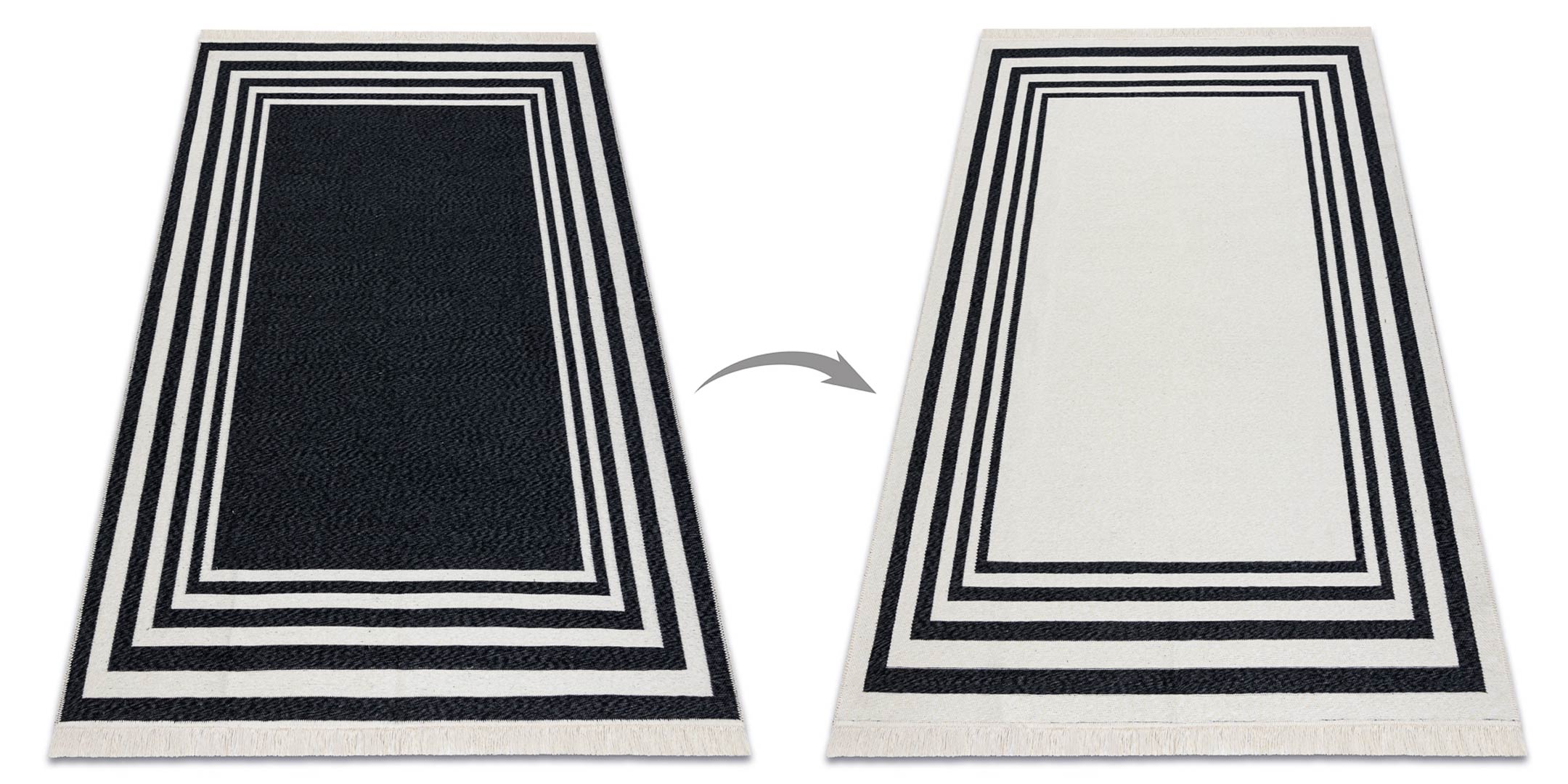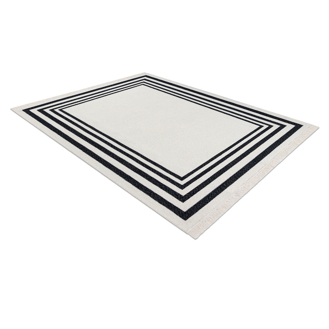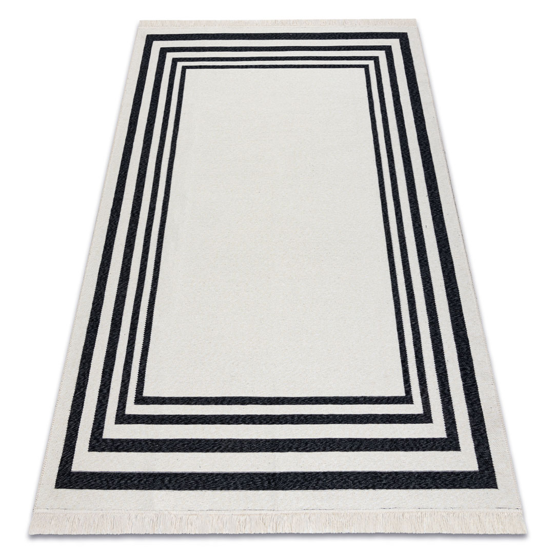 Czarno-kremowy dywan TWIN to połączenie nowoczesnego designu, funkcjonalności i ekologicznych materiałów. Minimalistyczny wzór z elegancką ramką oraz kontrastowe zestawienie czerni i kremu sprawiają, że dywan świetnie komponuje się zarówno z nowoczesnymi, jak i klasycznymi aranżacjami wnętrz. Doskonale sprawdzi się w salonie, sypialni, przedpokoju czy gabinecie, wprowadzając do pomieszczenia przytulny klimat i stylowy akcent.