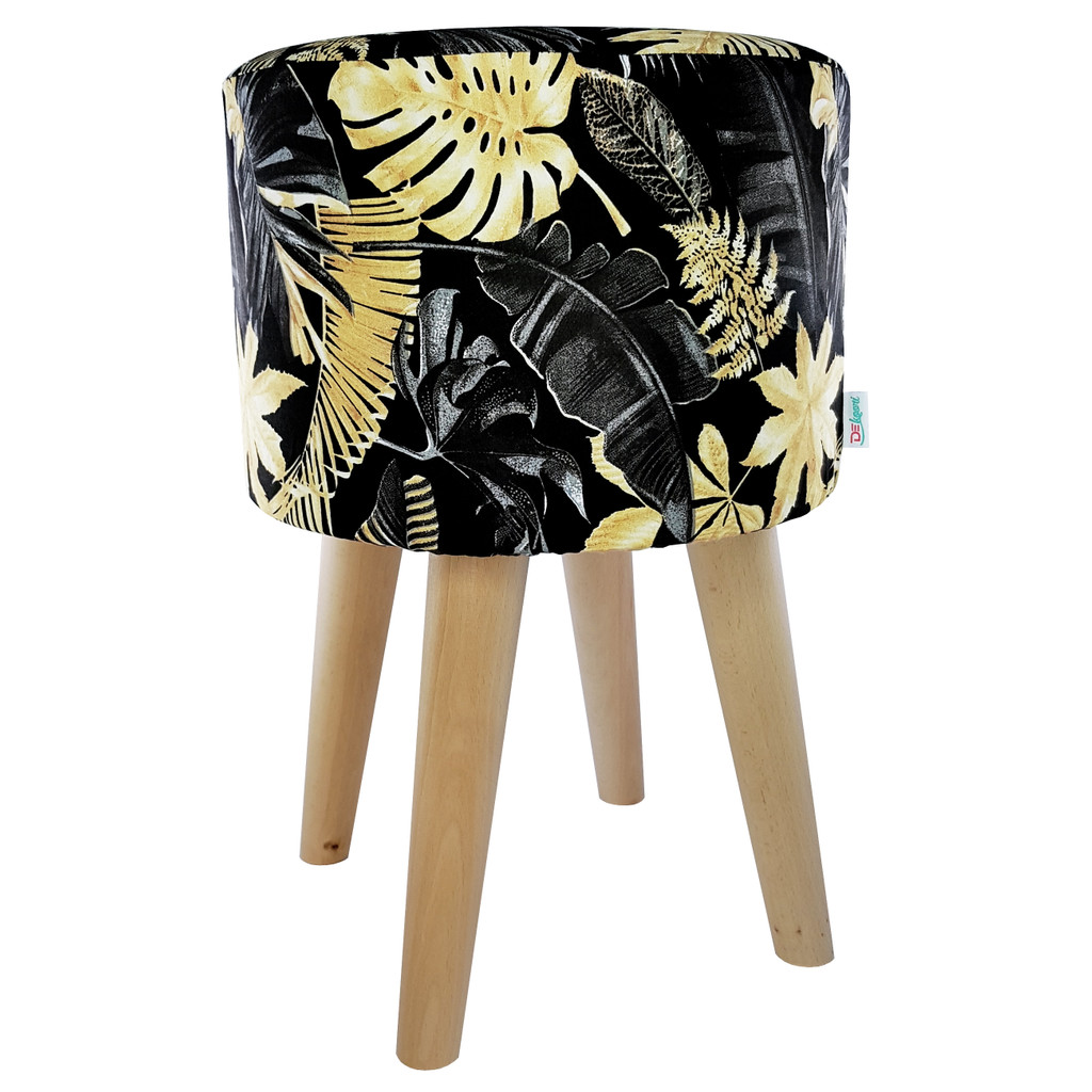 Elegancki, luksusowy, czarny puf do siedzenia w złote liście palmy. Połączenie przepięknej intensywnej czerni z równie urokliwym złotem to styl glamour w czystej postaci.