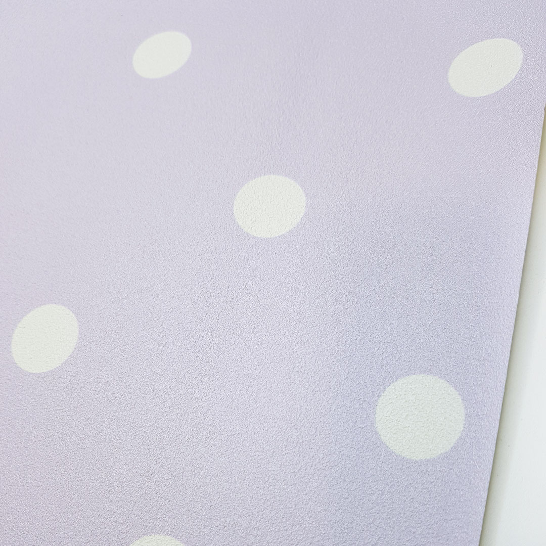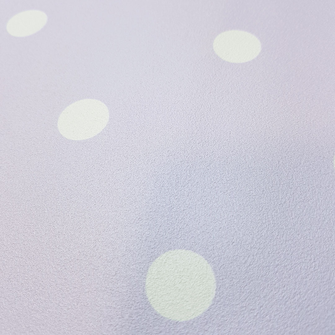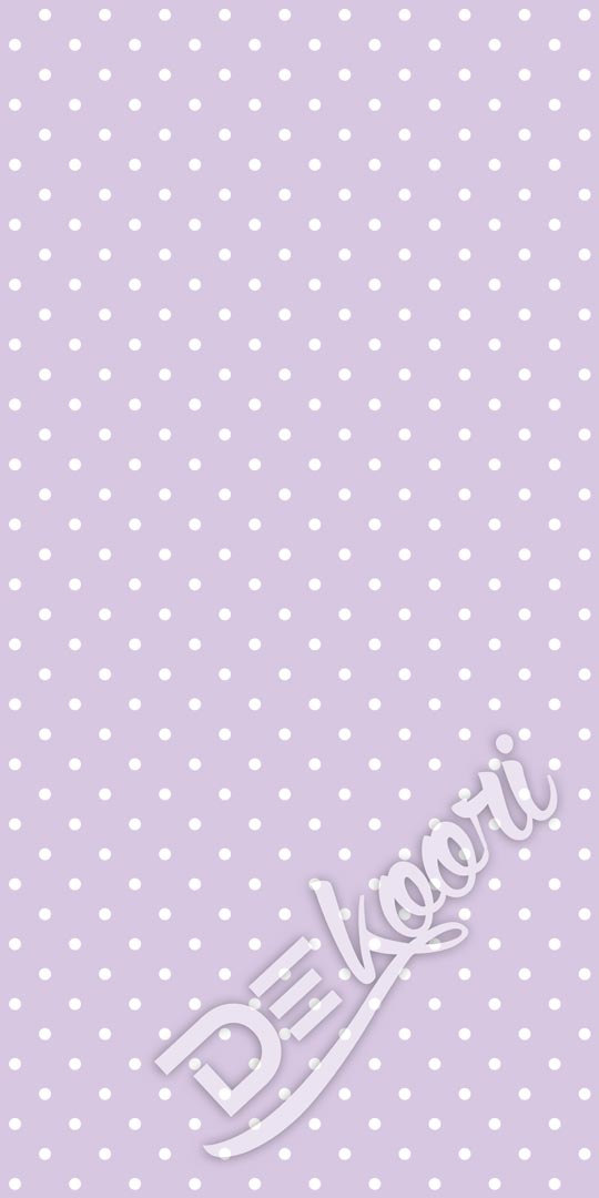 Urocza i modna fioletowa tapeta ścienna w niewielkie białe kropki, groszki. Jasna lawendowa, purpurowa barwa tapety dekoracyjnej oraz klasyczny design polka dot retro vintage.