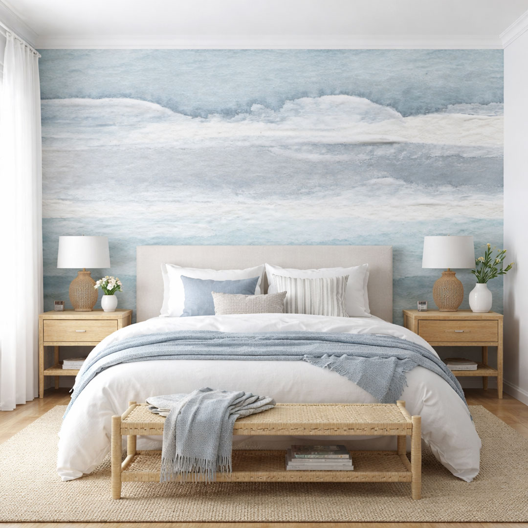 Stwórz w swojej sypialni prawdziwą oazę relaksu z naszą fototapetą akwarelową z delikatnymi falami w odcieniach niebieskiego, szarości, bieli i nutą turkusu. Jej subtelny, rozmyty malarski motyw przypominający spokojne fale wody wprowadza do wnętrza atmosferę wyciszenia, harmonii i elegancji - idealną do strefy wypoczynku. 🌊