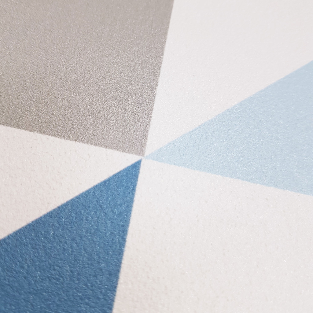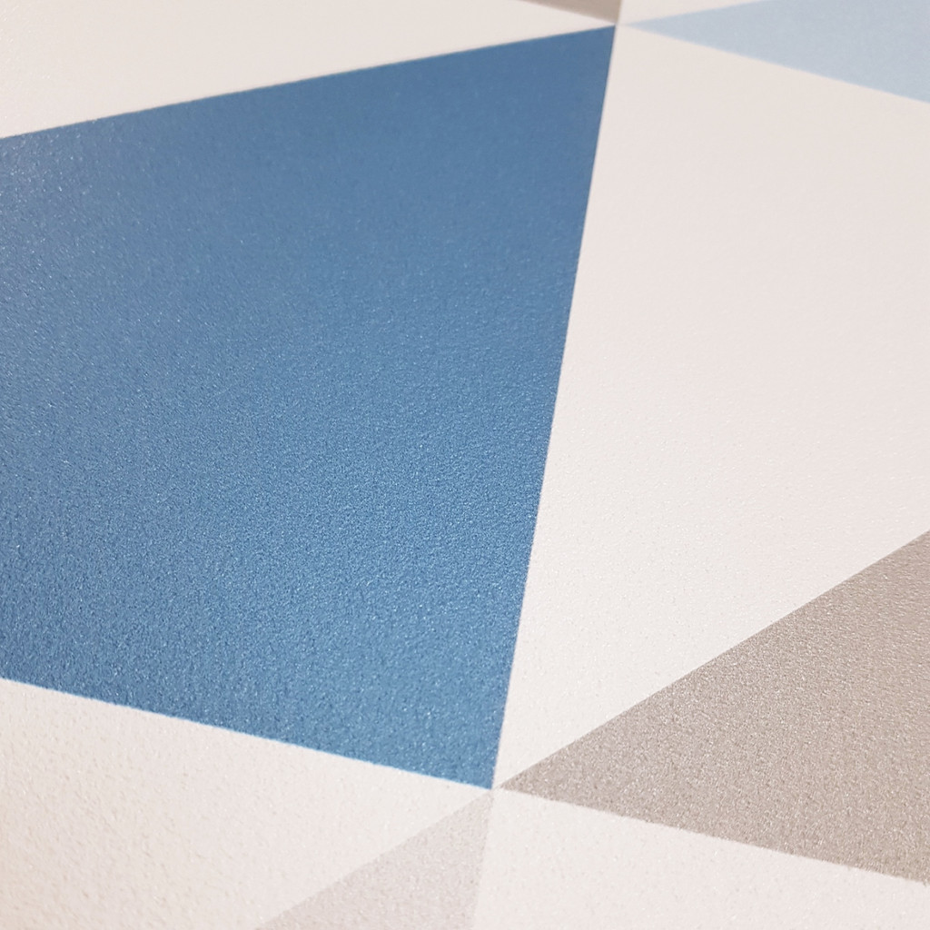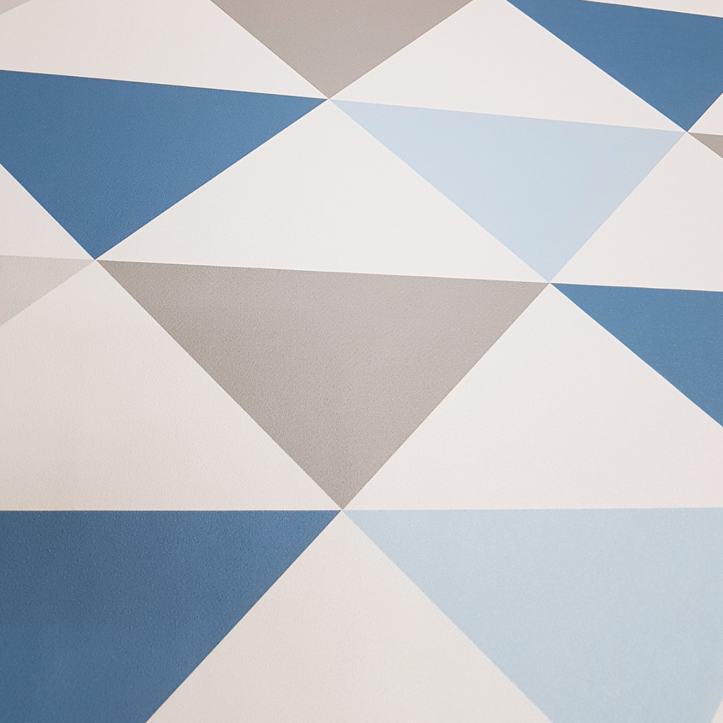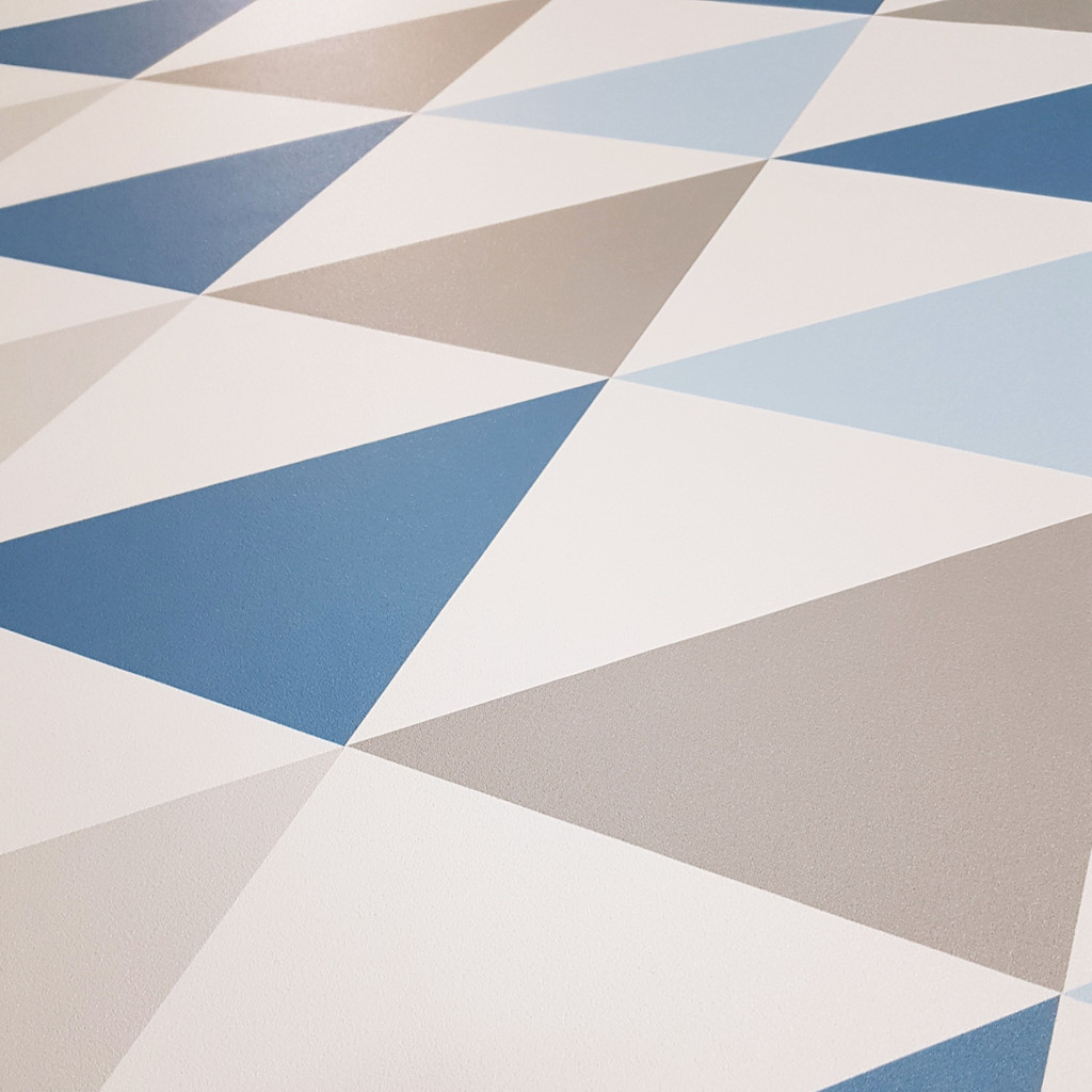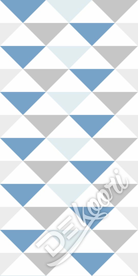 Nowoczesna tapeta ścienna w trójkąty o szerokości 33 cm w kolorach biały, szary oraz przydymionego niebieskiego. Sprawdź także pozostałe tapety geometryczne!