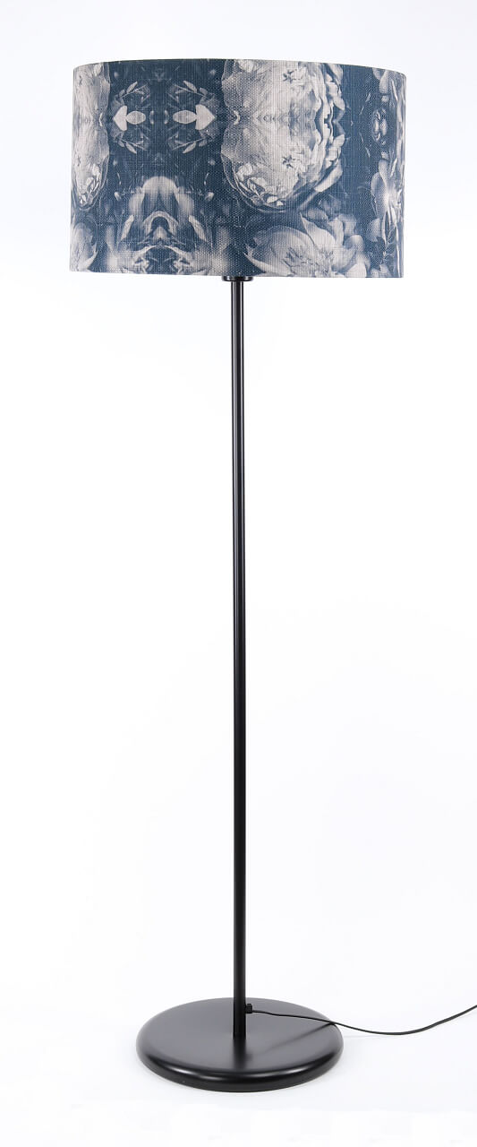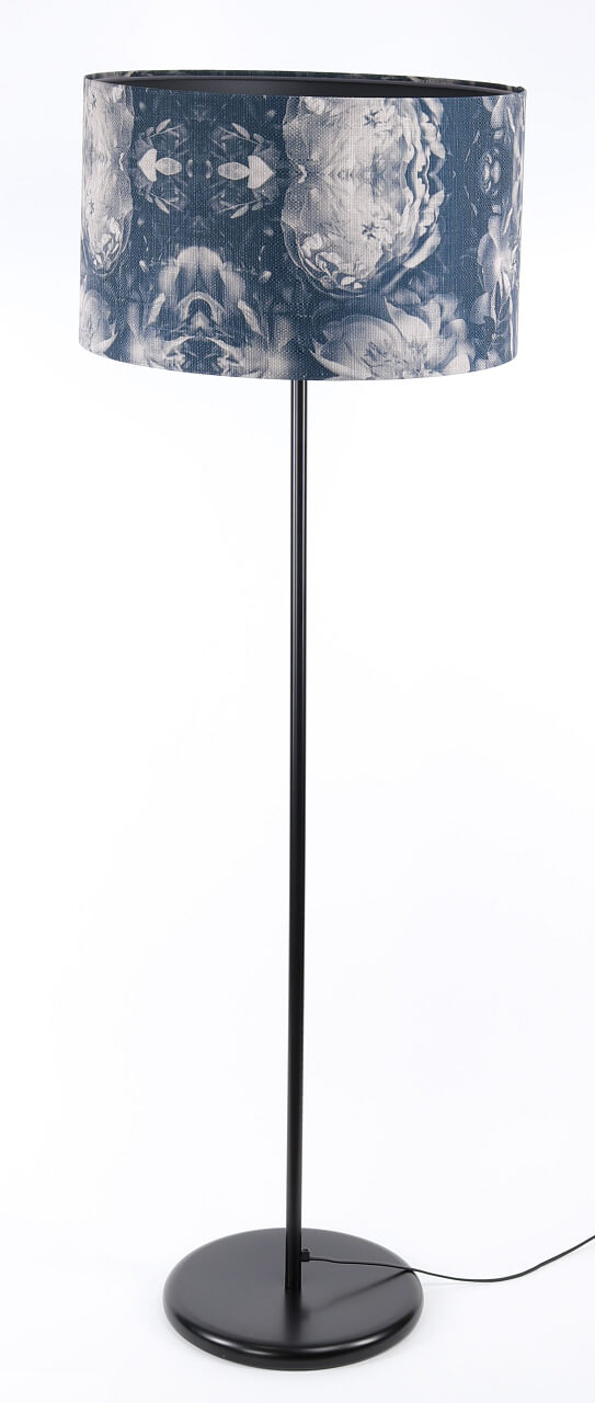 Grafitowa lampa podłogowa z abażurem w kształcie walca ze strukturalnej tkaniny, w kwiatowy wzór, stojąca PORTLAND