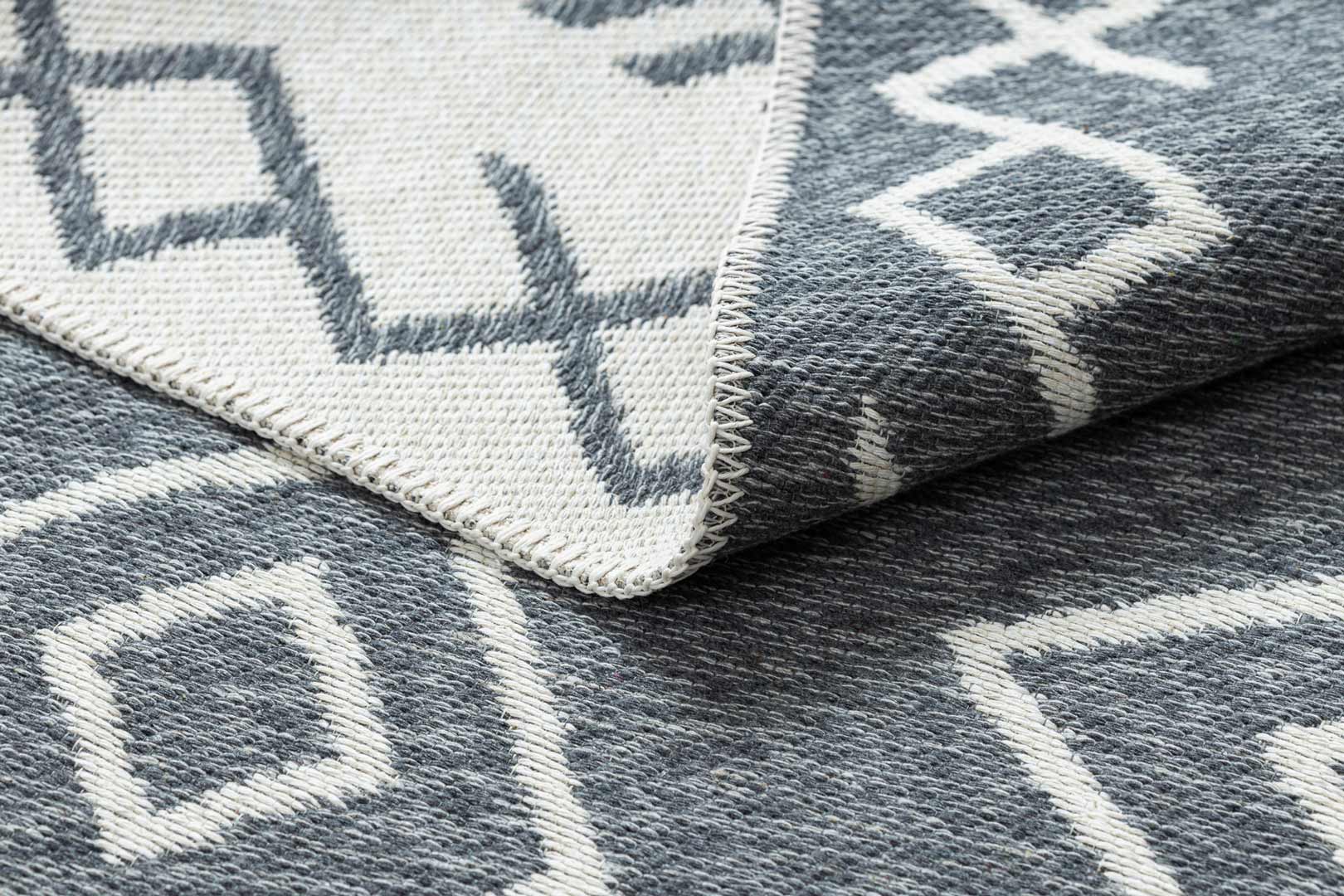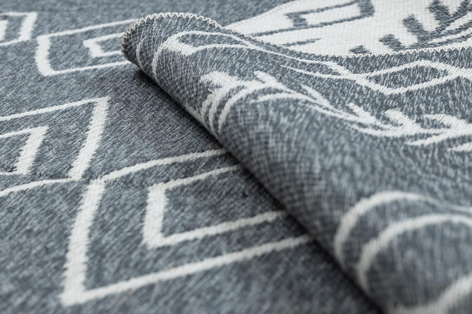 Dywan został wykonany w 100% z bawełny pochodzącej z recyklingu, dzięki czemu jest rozwiązaniem przyjaznym dla środowiska. Płasko tkana, pętelkowa struktura sprawia, że dywan jest lekki, trwały i bardzo łatwy w codziennym utrzymaniu czystości.