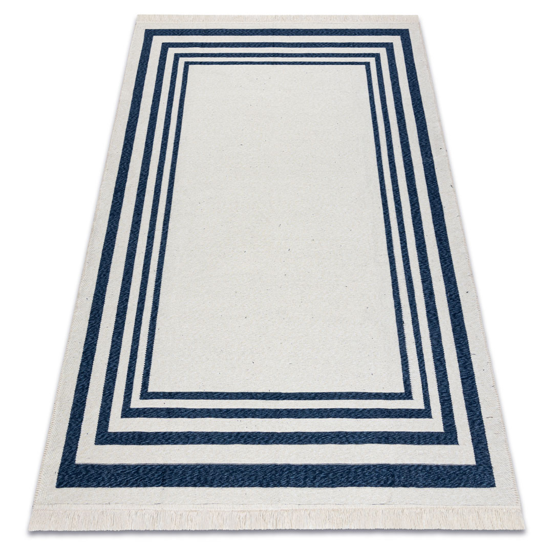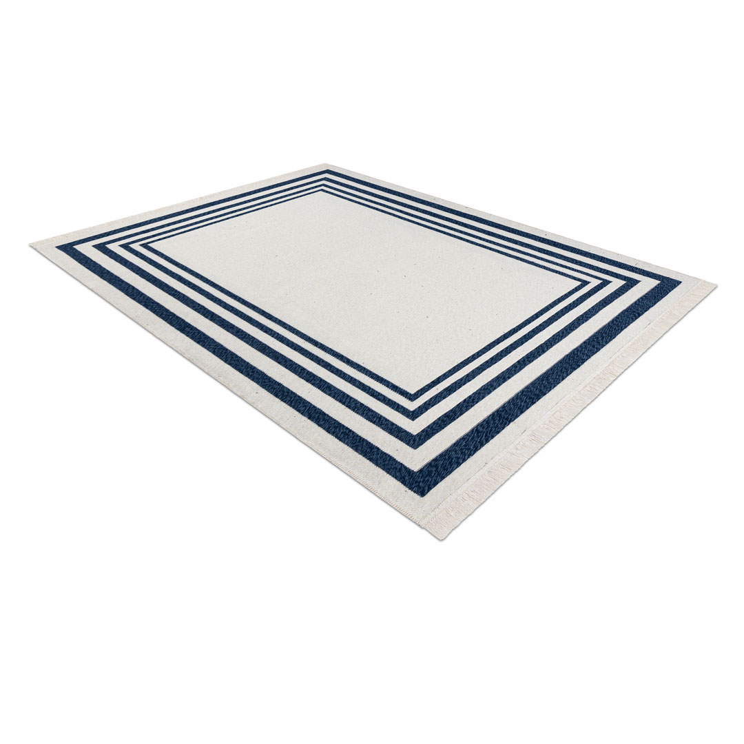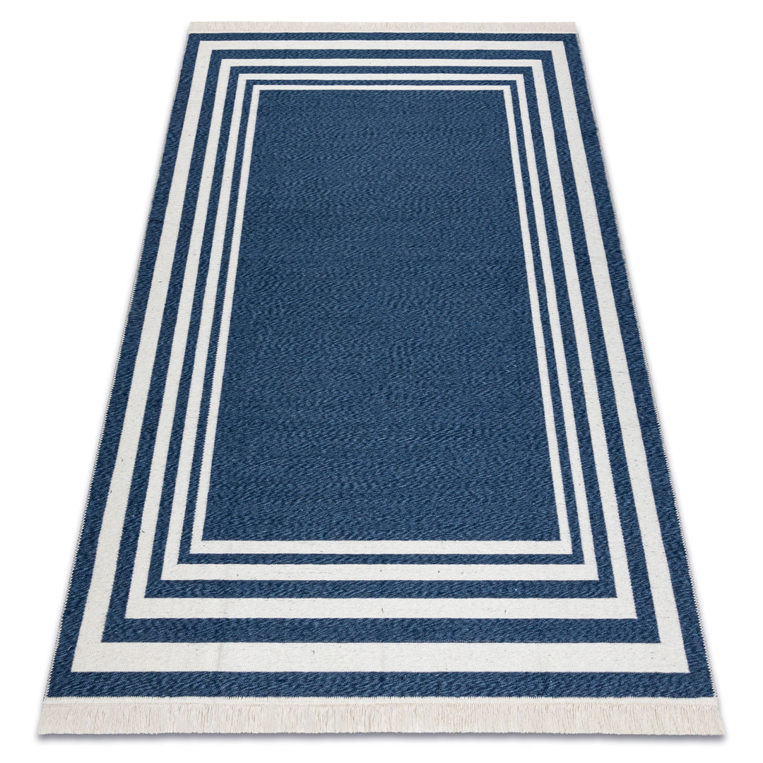 Granatowo-kremowy dywan TWIN to połączenie nowoczesnego designu, funkcjonalności i ekologicznych materiałów. Minimalistyczny wzór z elegancką ramką oraz kontrastowe zestawienie granatu i kremu sprawiają, że dywan świetnie komponuje się zarówno z nowoczesnymi, jak i marynistycznymi aranżacjami wnętrz. Doskonale sprawdzi się w salonie, sypialni, przedpokoju czy w łazience, wprowadzając do pomieszczenia przytulny klimat i stylowy akcent.