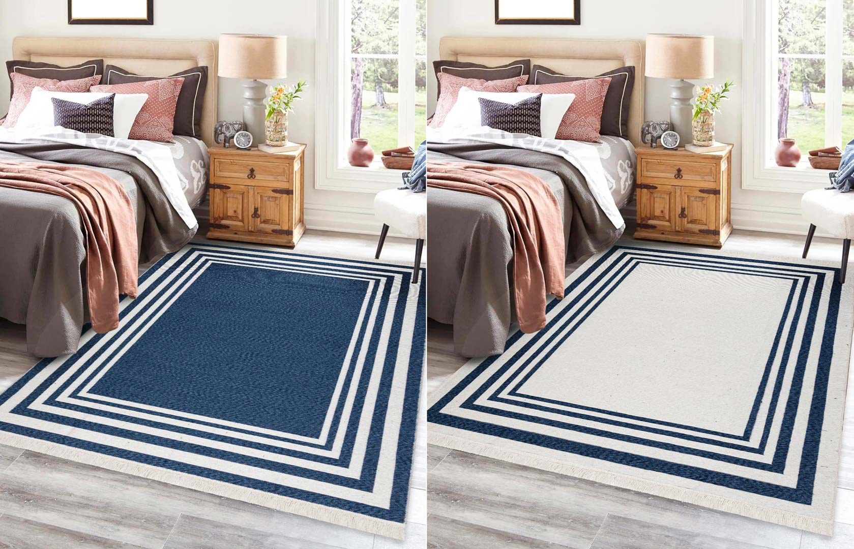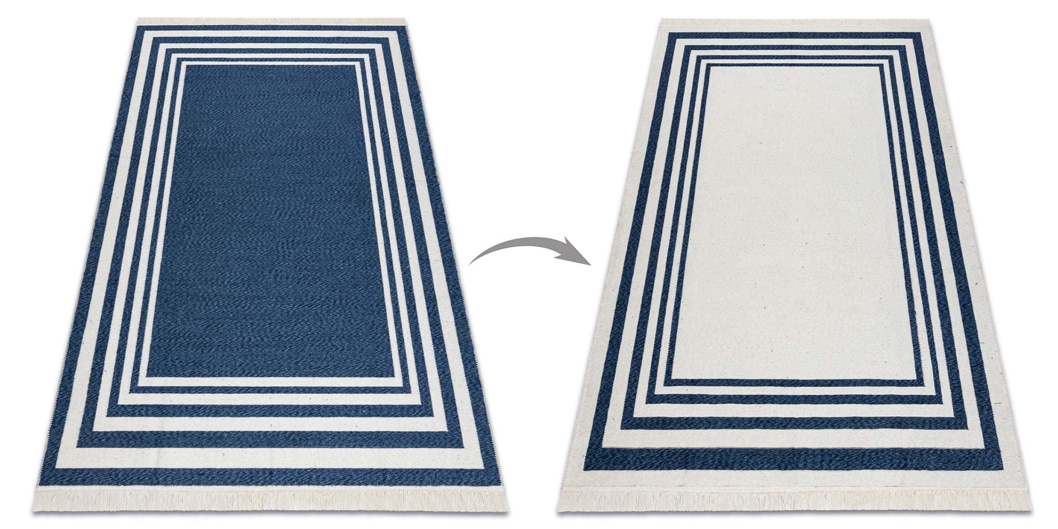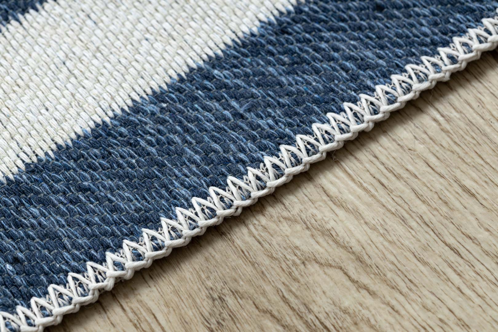 Granatowo-kremowy dywan TWIN to połączenie nowoczesnego designu, funkcjonalności i ekologicznych materiałów. Minimalistyczny wzór z elegancką ramką oraz kontrastowe zestawienie granatu i kremu sprawiają, że dywan świetnie komponuje się zarówno z nowoczesnymi, jak i marynistycznymi aranżacjami wnętrz. Doskonale sprawdzi się w salonie, sypialni, przedpokoju czy w łazience, wprowadzając do pomieszczenia przytulny klimat i stylowy akcent.