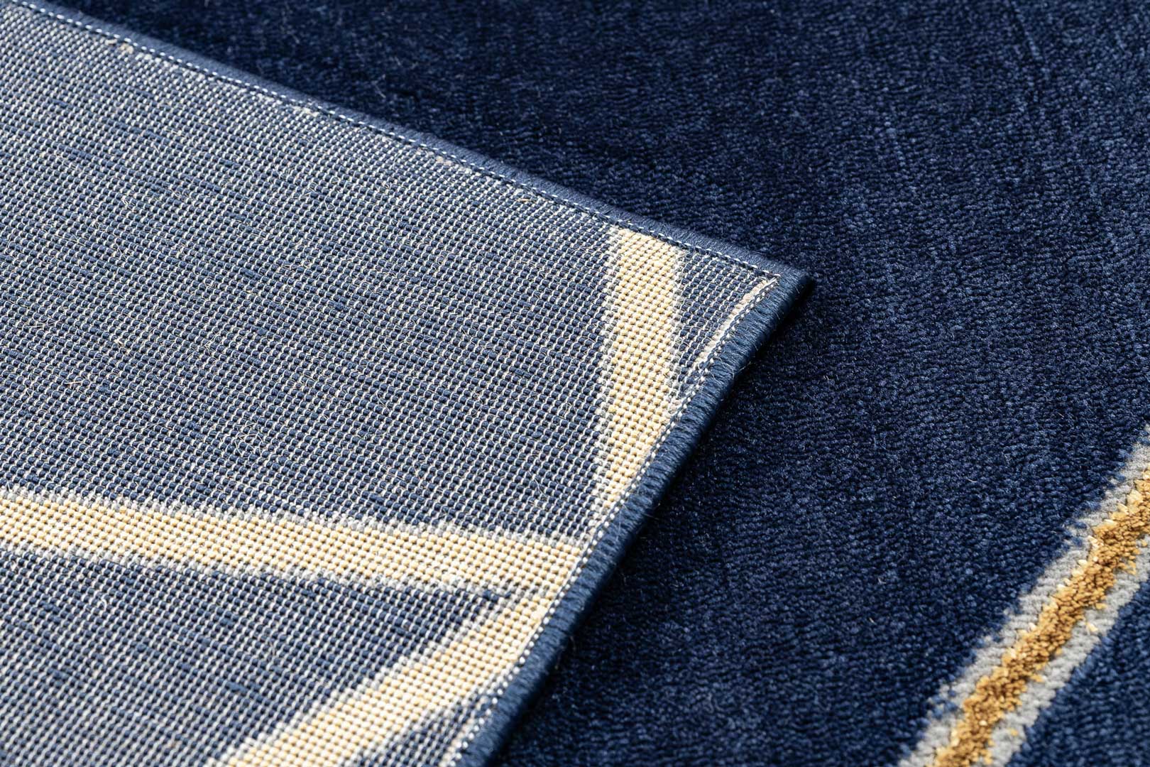 Ten elegancki i stylowy, granatowy dywan ze złotym wzorem geometrycznym będzie niesamowitym dopełnieniem klasycznego salonu, w którym goszczą złote dekoracje. Dzięki polipropylenowi z dodatkiem poliestru jest on bardzo wytrzymały, łatwy w czyszczeniu chemicznym i odkurzaniu oraz bezpieczny dla alergicznych domowników!