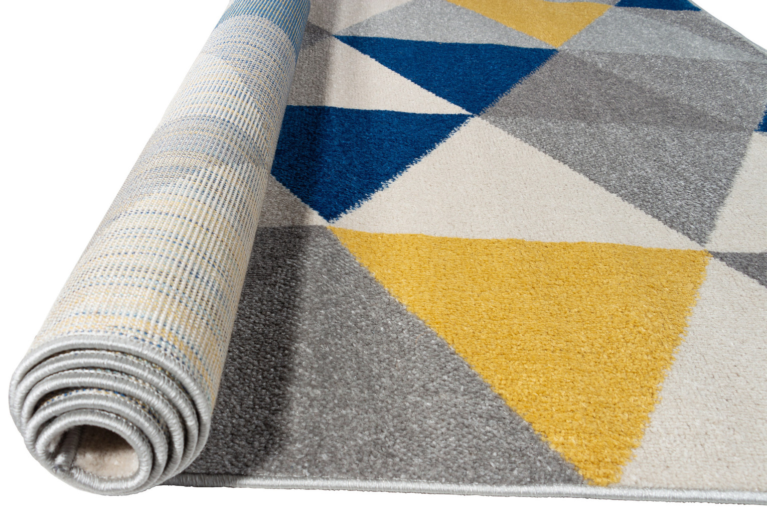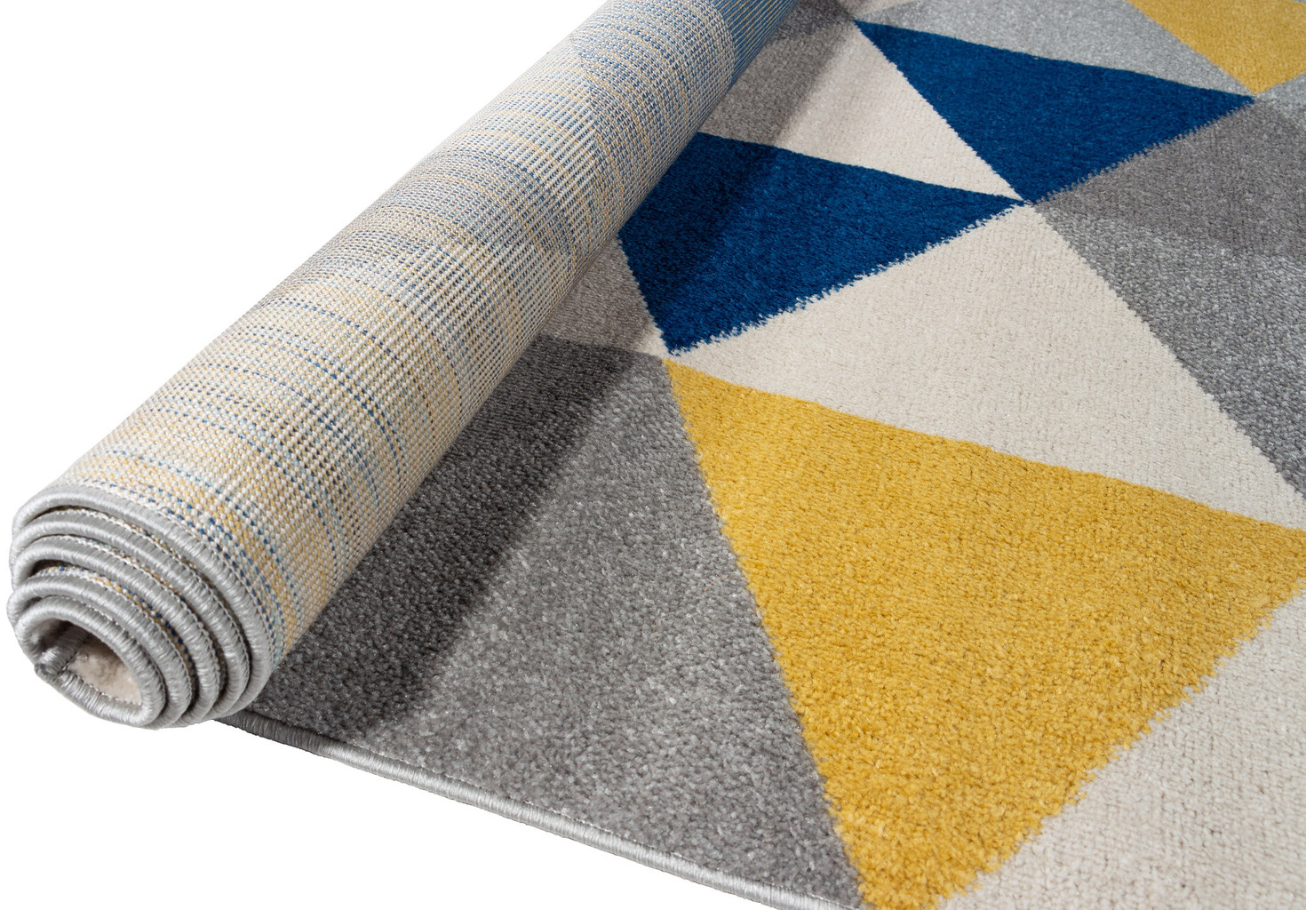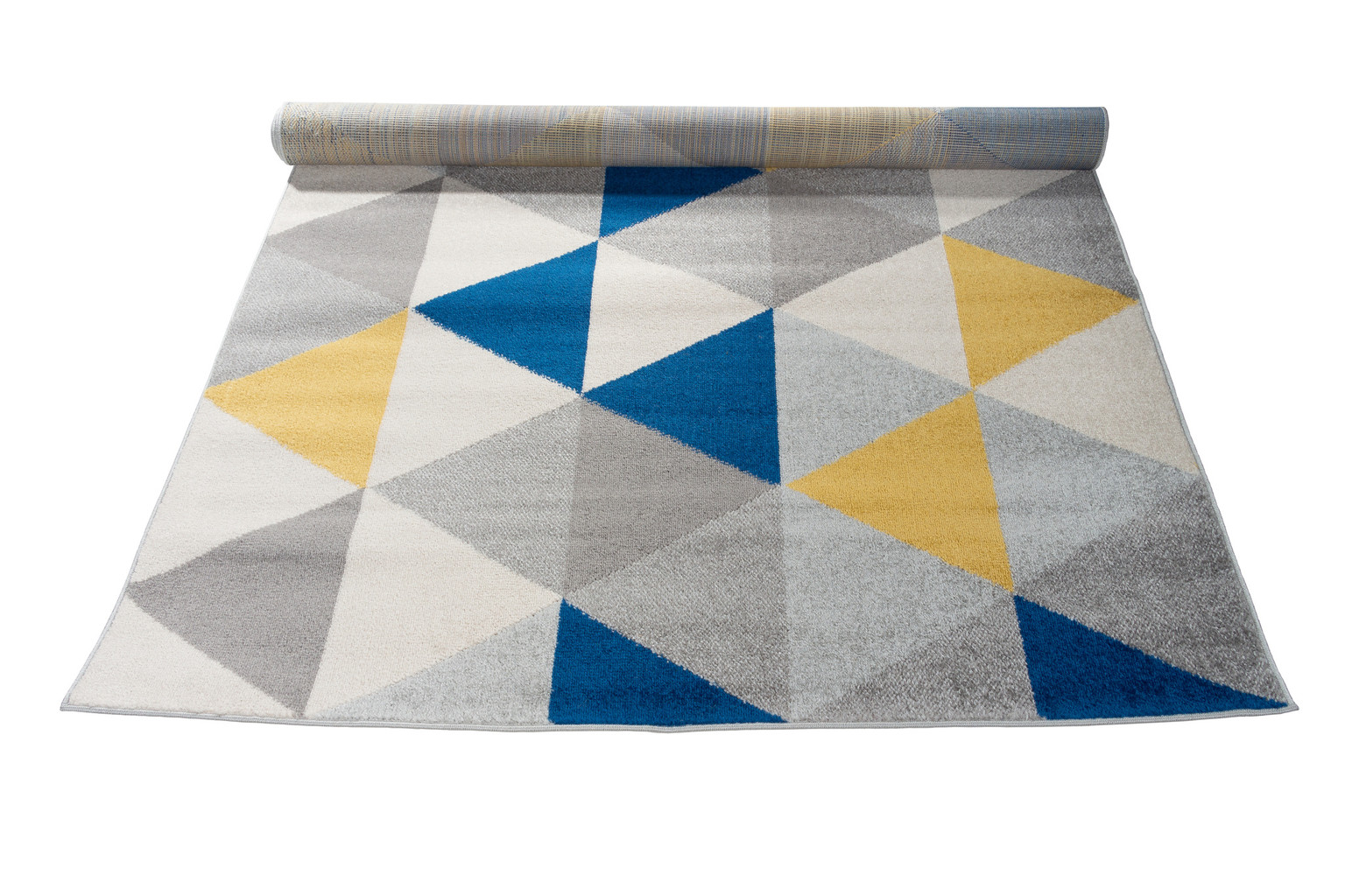 To niezwykłe połączenie niebieskich i słonecznie żółtych trójkątów z pewnością rozjaśni każde wnętrze, a dodatkowo spowoduje, że poczujesz się w nim lepiej niż kiedykolwiek. Szczególnie dobrze odnajdzie się w nowoczesnych, patchworkowych i skandynawskich pomieszczeniach. Polipropylen i włókna heat set frise są miękkie, trwałe i nie stanowią zagrożenia dla najmłodszych, nawet tych z problemami alergicznymi.