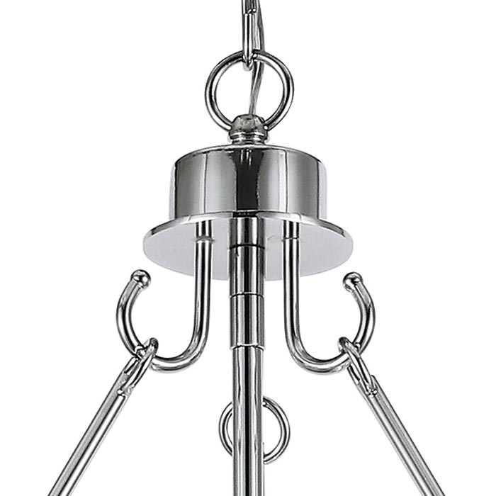 Klasyczna lampa chromowana o trzech punktach świetlnych w szklanym kloszu.
