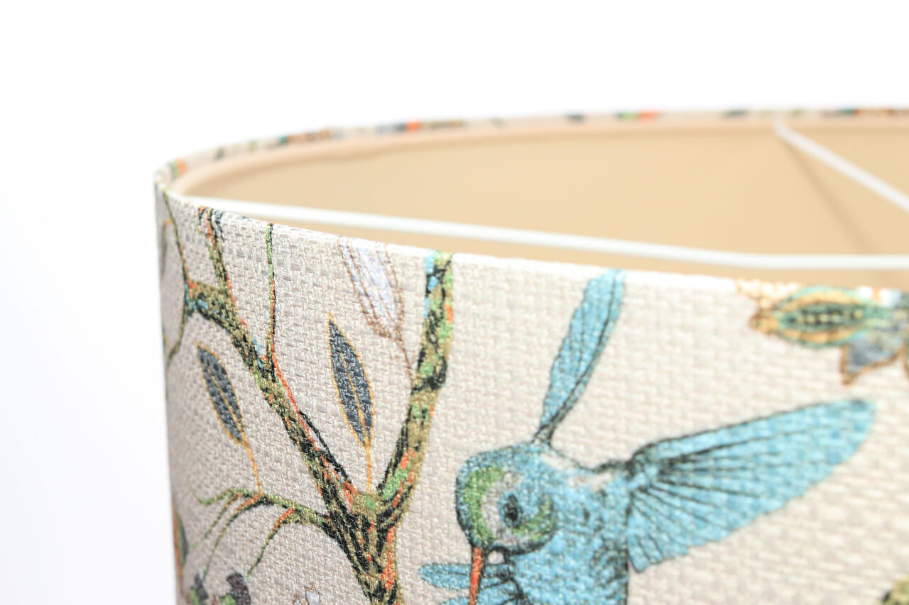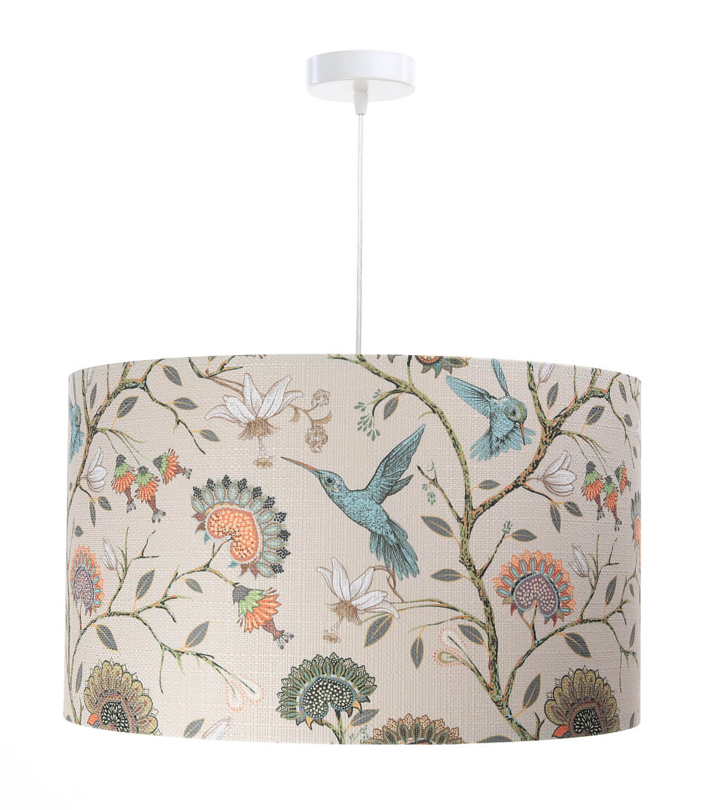 • Kolor abażura: kremowy w kolorowe kwiaty i niebieskie kolibry