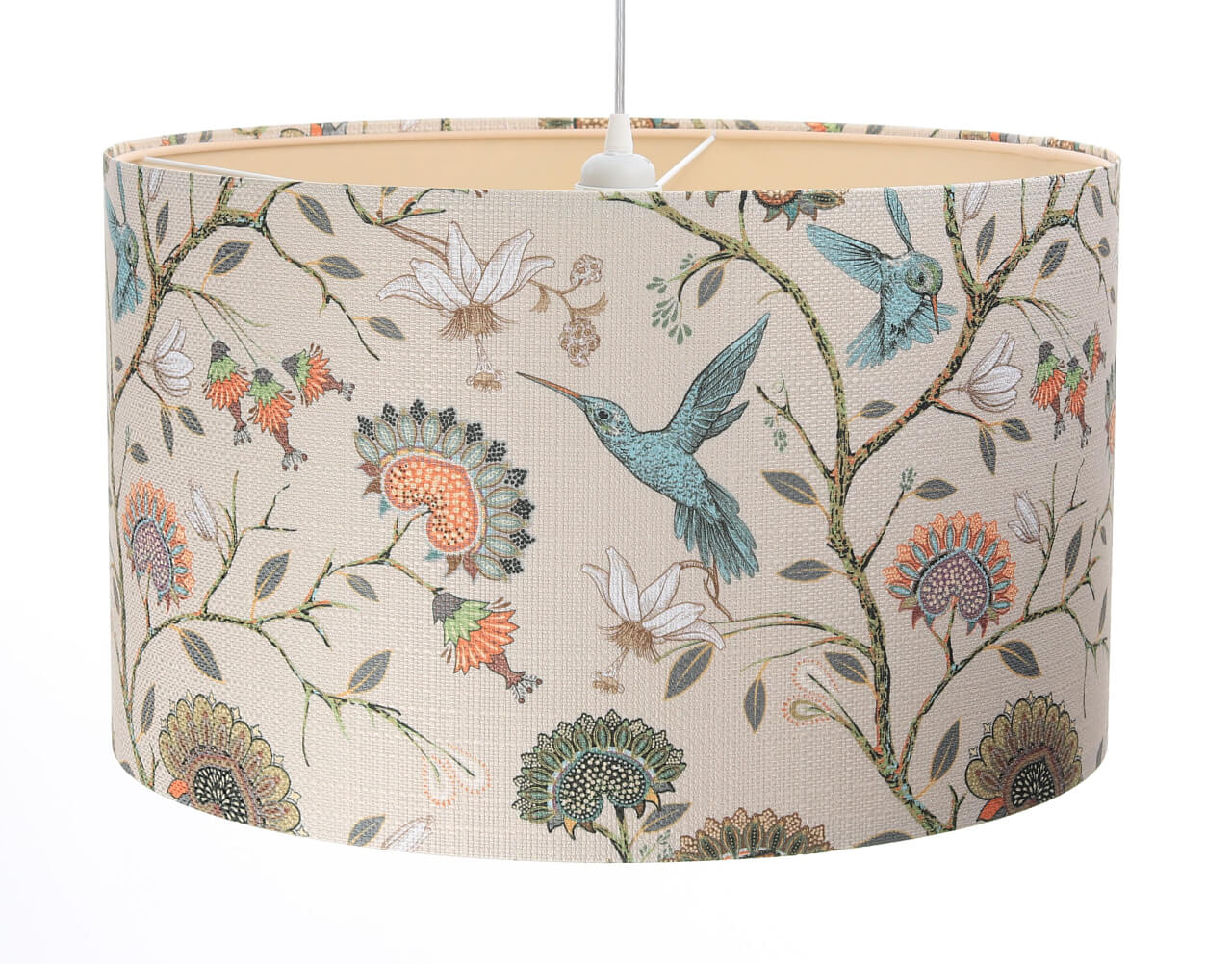 Kremowa lampa wisząca z walcowym abażurem z tkaniny strukturalnej w kwiaty i koliberki PORTLAND
