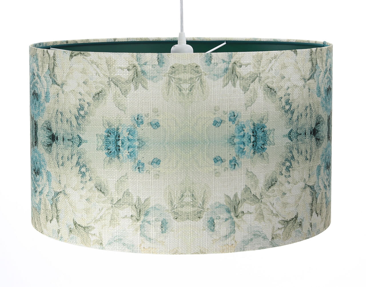 Kwiatowa, przecierana lampa wisząca z abażurem w kształcie walca z zielonym wnętrzem PORTLAND