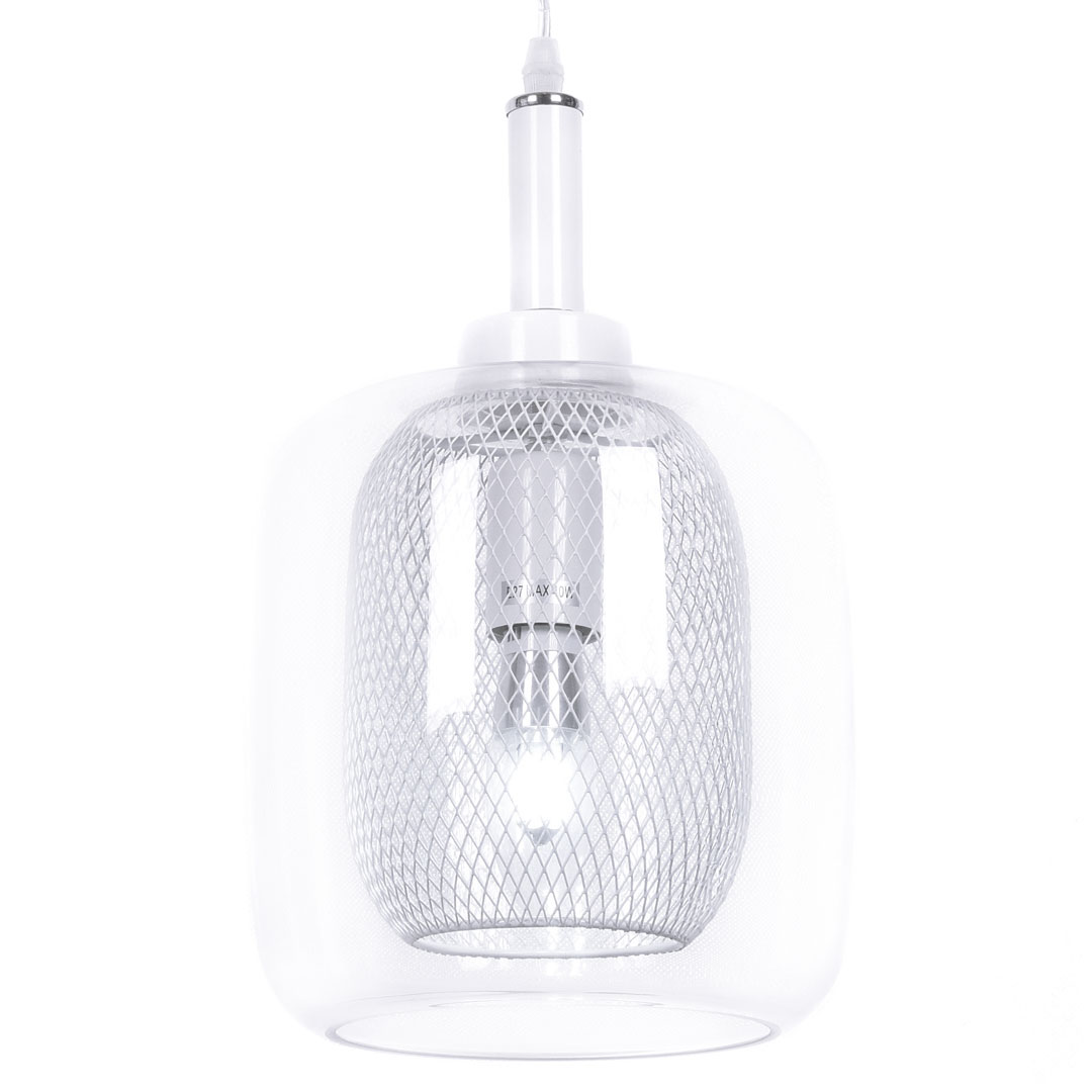 Bardzo modna, nowoczesna lampa wisząca BESSA z białą ozdobną siateczką i przezroczystym, szklanym kloszem. Tego typu zwis pasuje zarówno do stylu skandynawskiego jak i loftowego, industrialnego. Model cieszy się dużym zainteresowaniem.