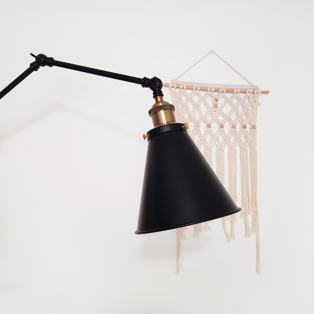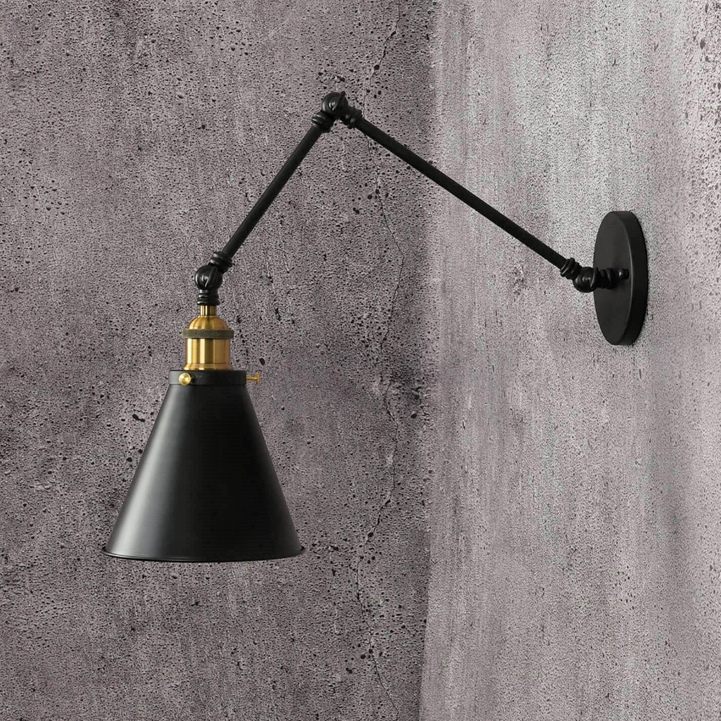 Modna lampa ścienna loft RUBI W2 z czarnym, stożkowym kloszem. Wykonany z metalu, w stylu industrialnym, dzięki czemu sprawdzi się przede wszystkim we wnętrzach retro, vintage. Jest to kinkiet na wysięgniku, dzięki któremu można ustawić światło np. do czytania w sypialni lub salonie.