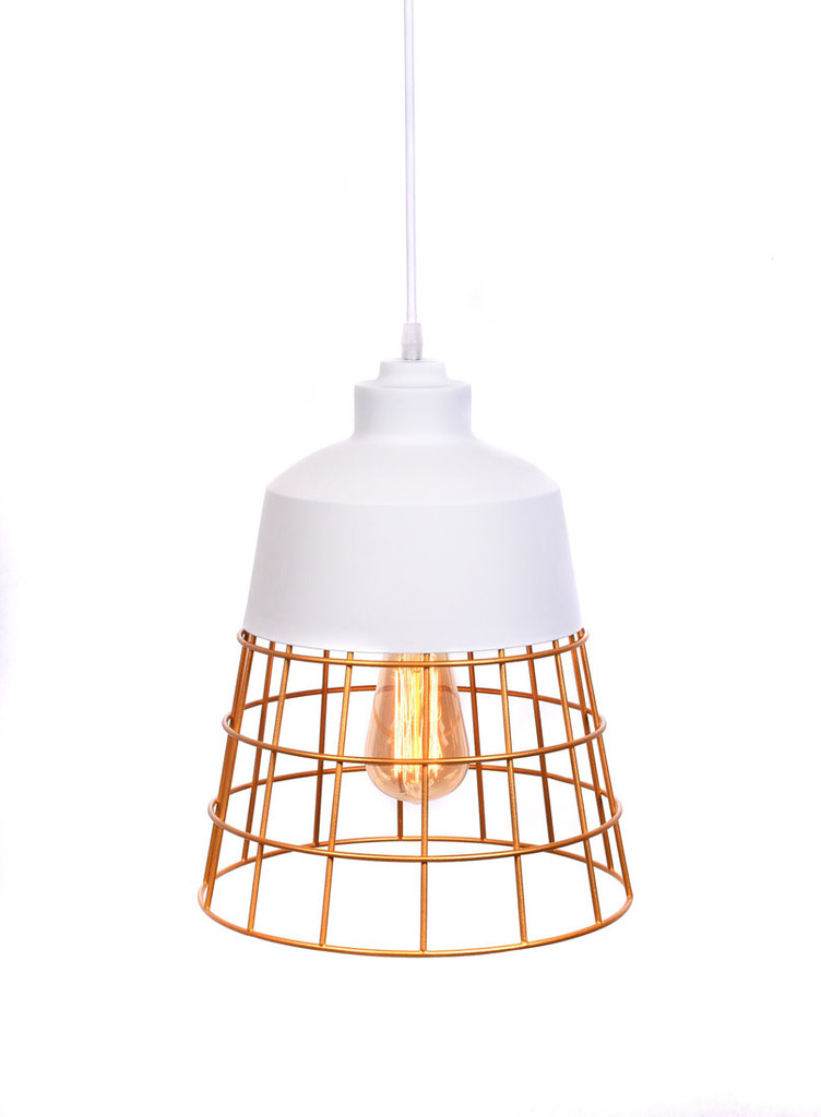 Industrialna lampa wisząca druciana biało-złota pasująca do stylu industrialnego, loft a także skandynawskiego. Biała oprawa metalowa, klosz z drutu złotego.