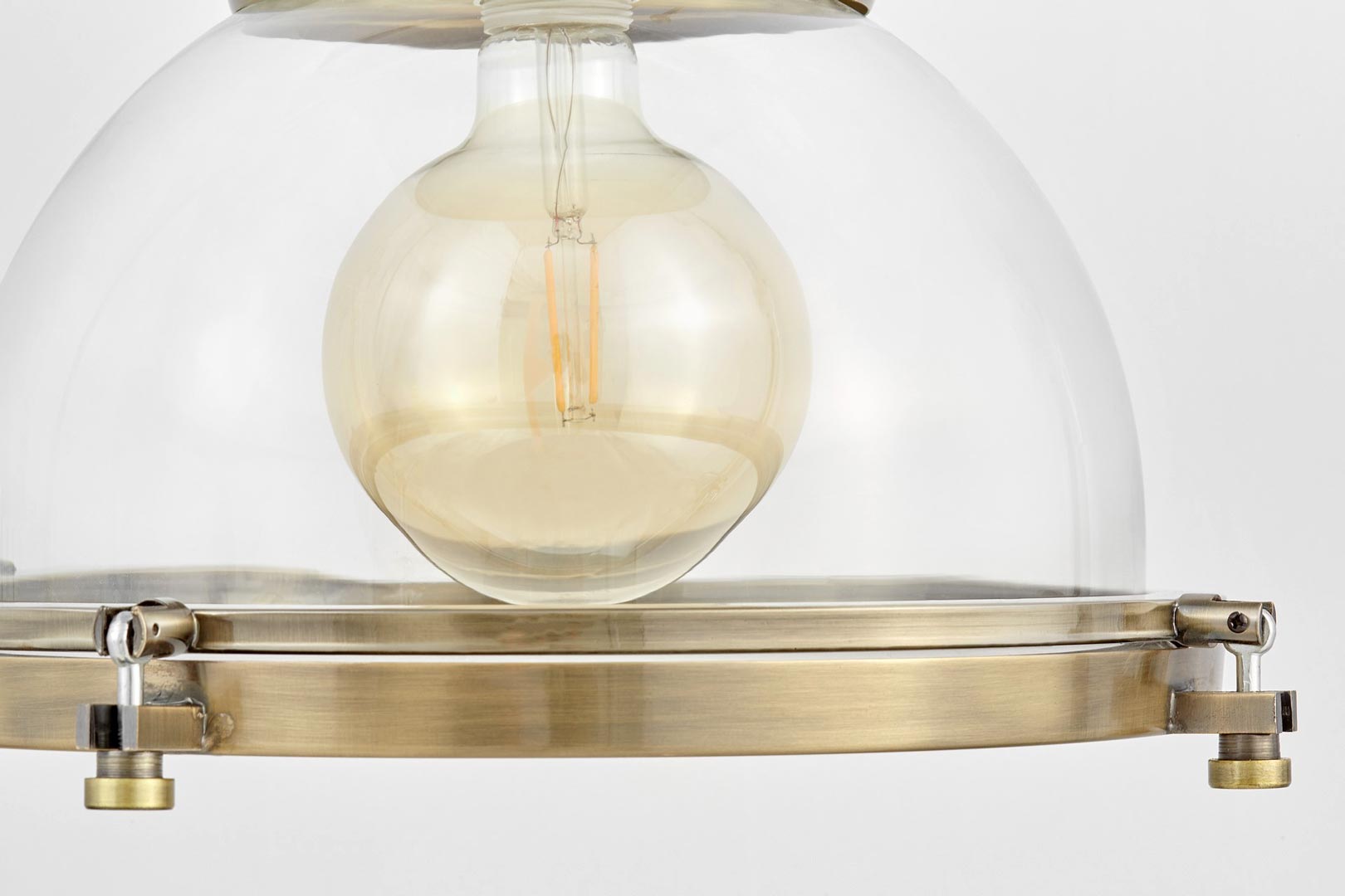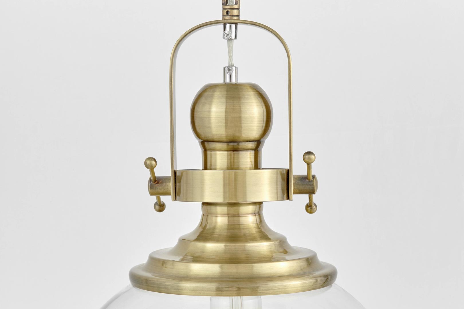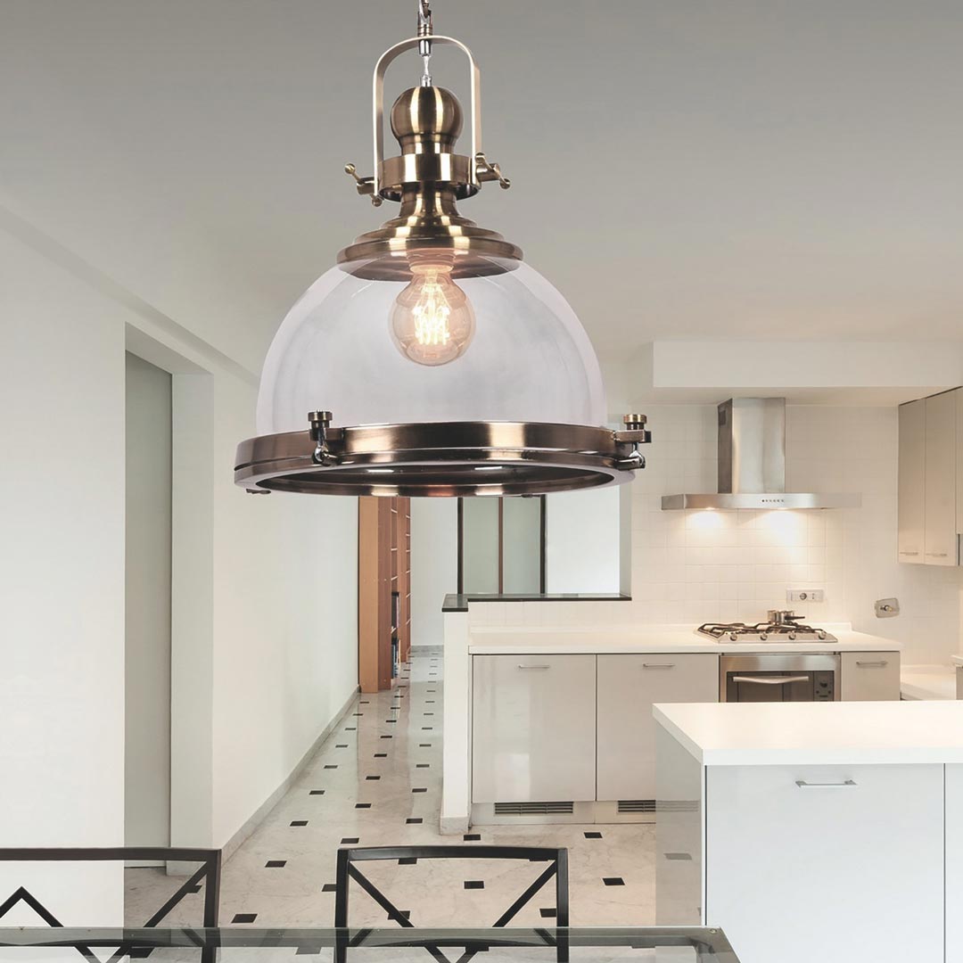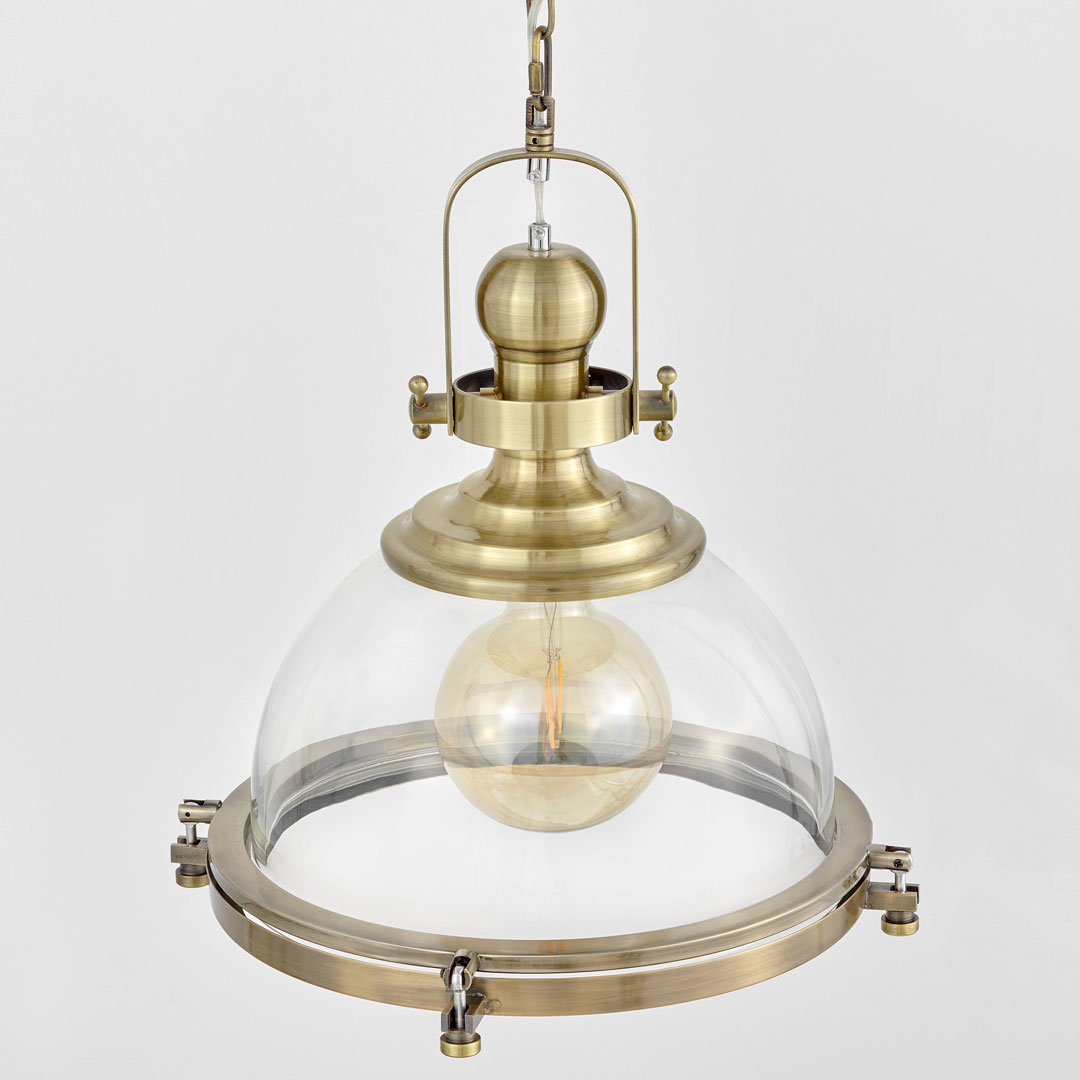 Wisząca na łańcuchu lampa industrialna loft w stylu skandynawskim, którą cechuje przemysłowy design. Wykonana ze szkła oraz metalu w mosiężnym odcieniu.