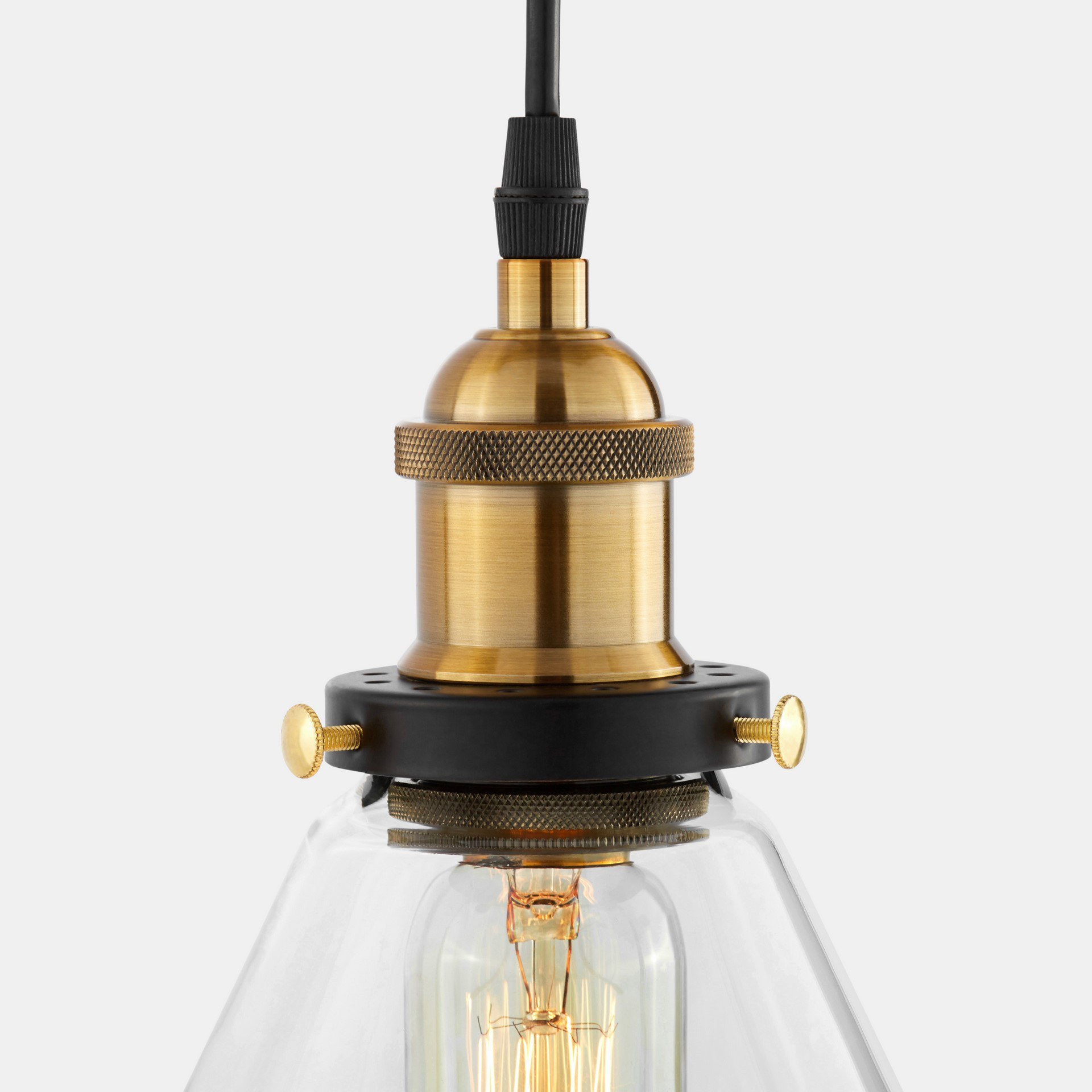 Zwis sufitowy, wisząca lampa industrialna, skandynawska w stylu loft. Szklany, przezroczysty klosz w kształcie stożka oraz elementy metalowe.