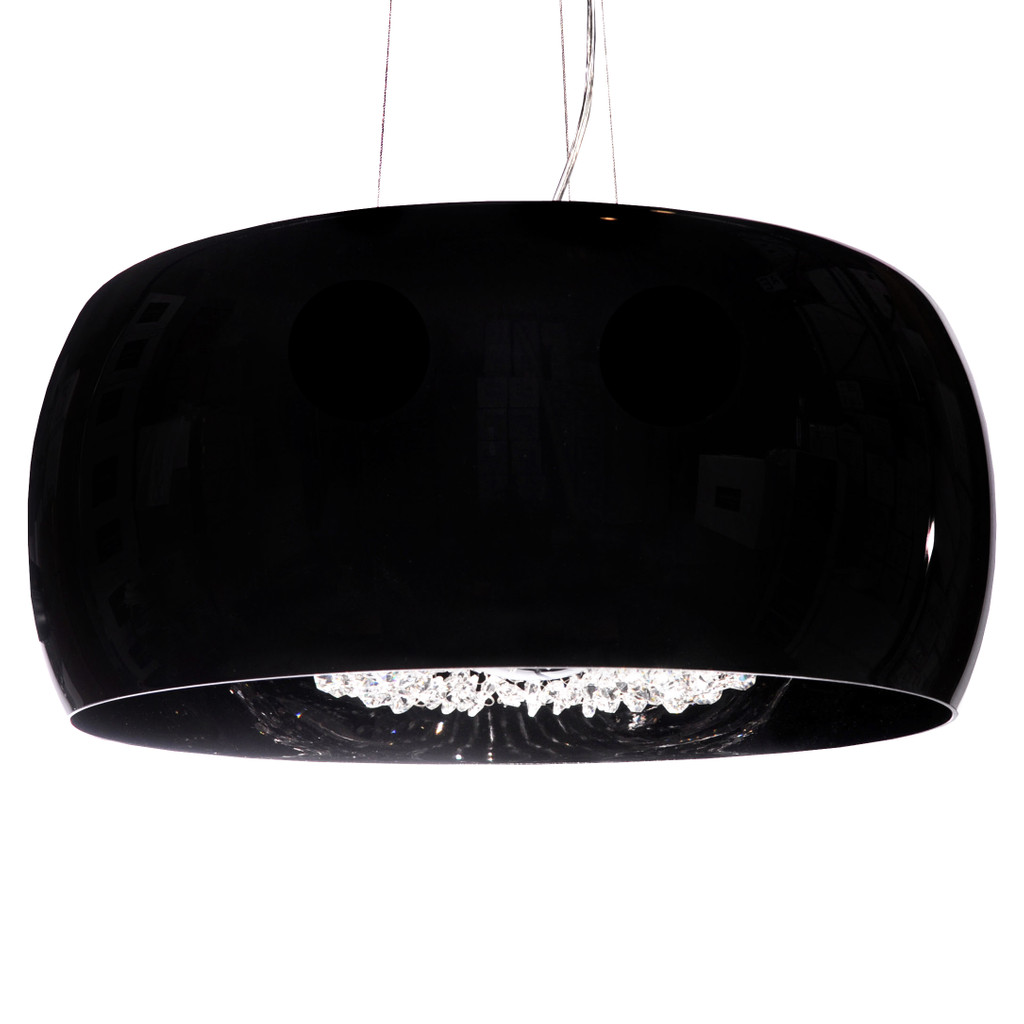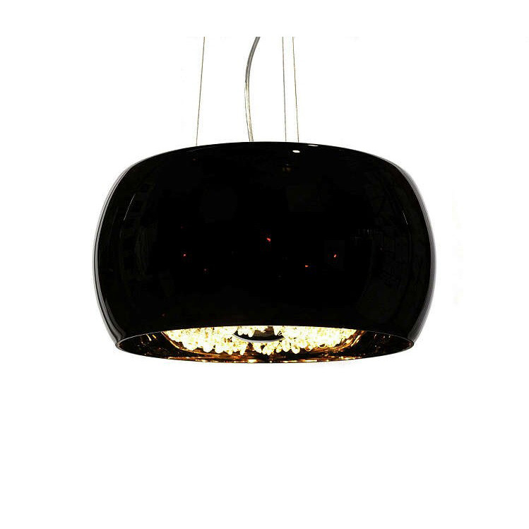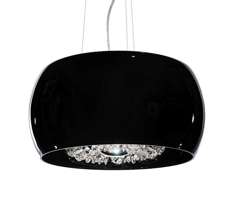 Nowoczesna, sufitowa, czarna lampa wisząca wykonana ze szkła, kryształowych łańcuszków z kryształu najwyższej jakości oraz metalu. Dostępna w dwóch rozmiarach o średnicy 40 lub 50 cm. Obie wersje pokazane są na zdjęciach.