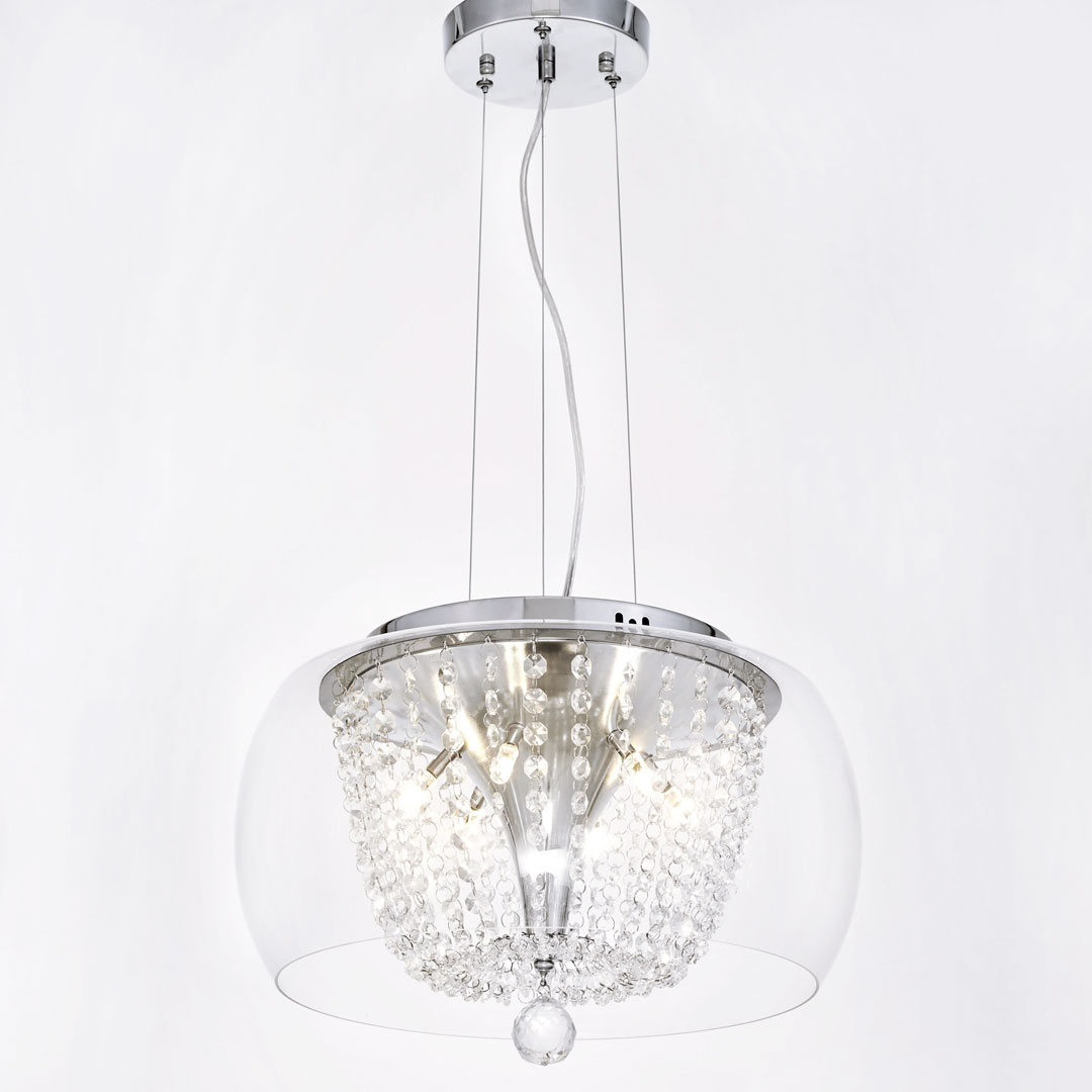 Nowoczesna, sufitowa, przeźroczysta lampa wisząca wykonana ze szkła, kryształu najwyższej jakości oraz metalu. Dostępna w dwóch rozmiarach o średnicy 40 lub 50 cm. Obie wersje pokazane są na zdjęciach.