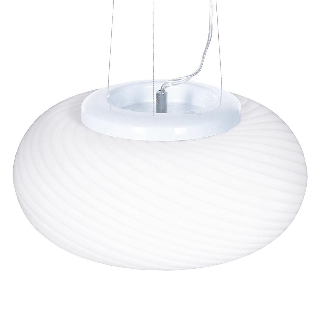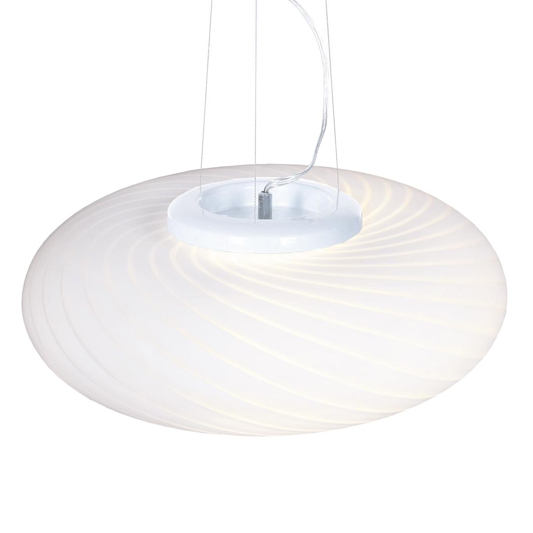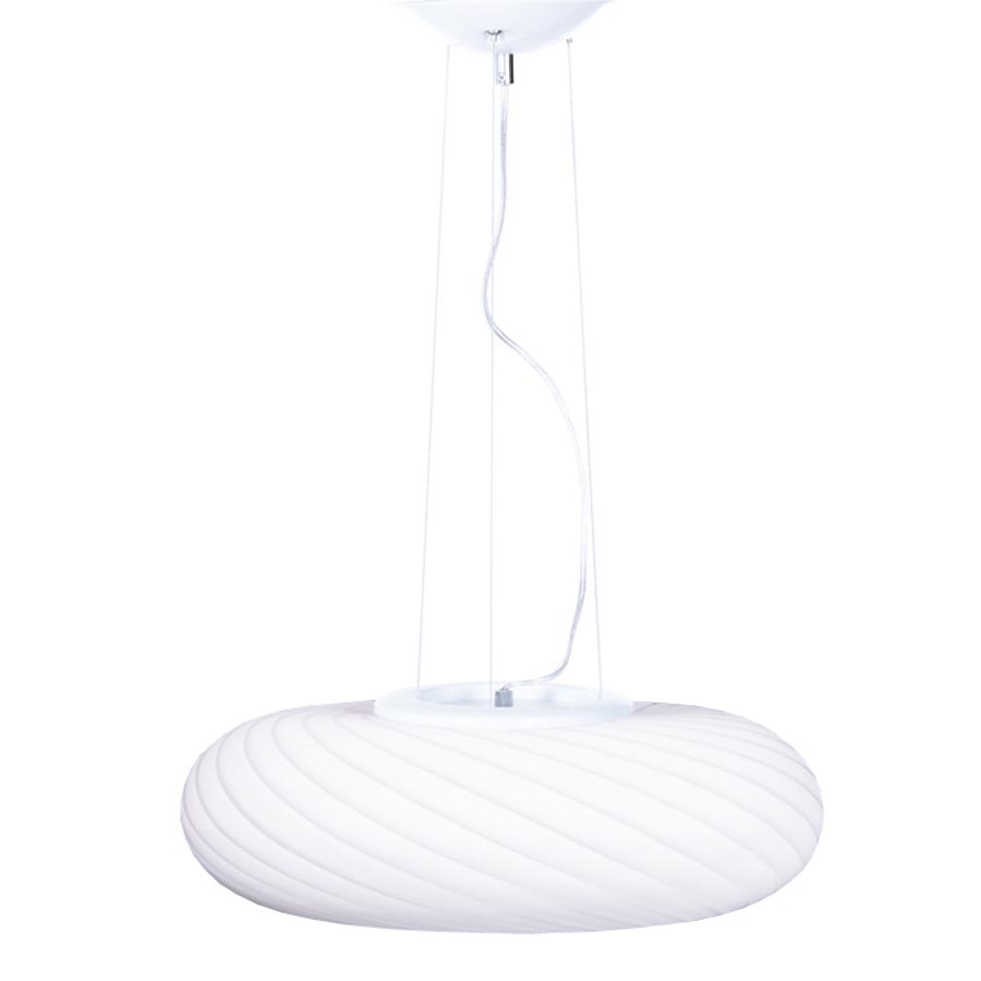 Biała, nowoczesna lampa wisząca. Szklana oprawa we wzorek w paski. Dostępna w dwóch wariantach: mniejszym o średnicy 38 cm i większym o średnicy 48 cm.