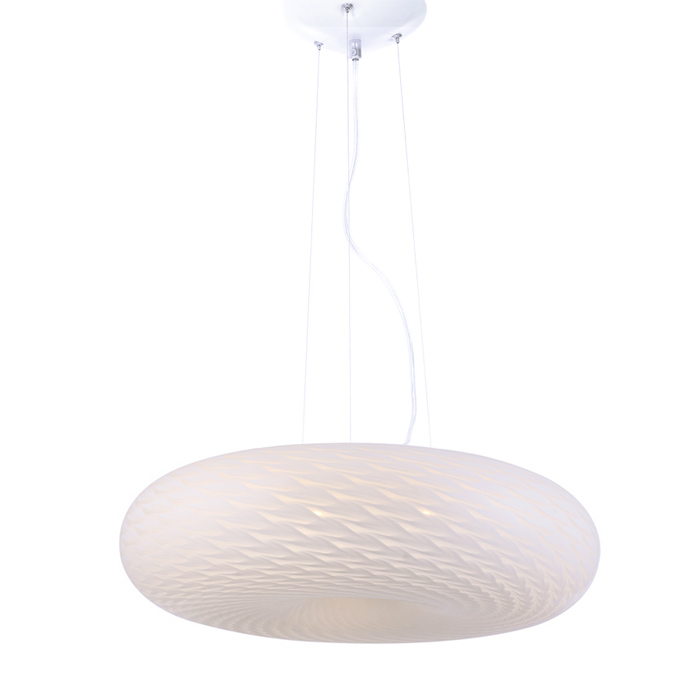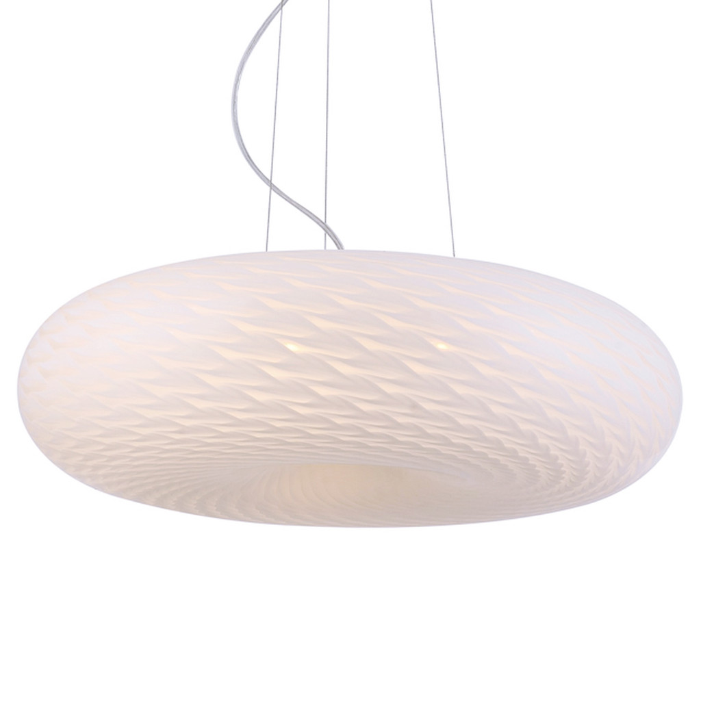 Biała, szklana lampa wisząca EVIANTE o szklanej, wzorzystej powierzchni i nowoczesnym designie. Dostępna w dwóch wariantach: mniejszym o średnicy 38 cm i większym o średnicy 48 cm.