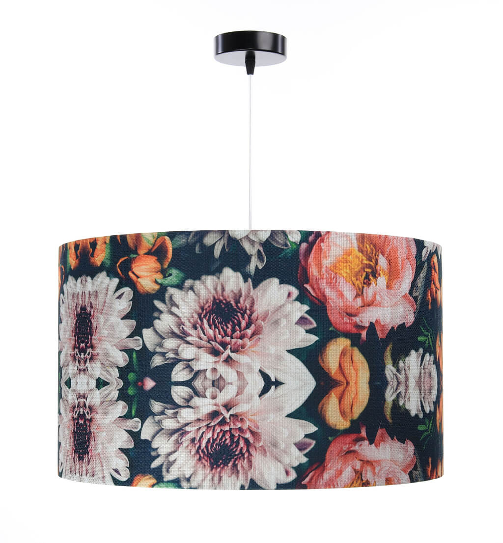 Lampa wisząca z abażurem w kształcie walca w kolorowe kwiaty, z czarnym wnętrzem PORTLAND