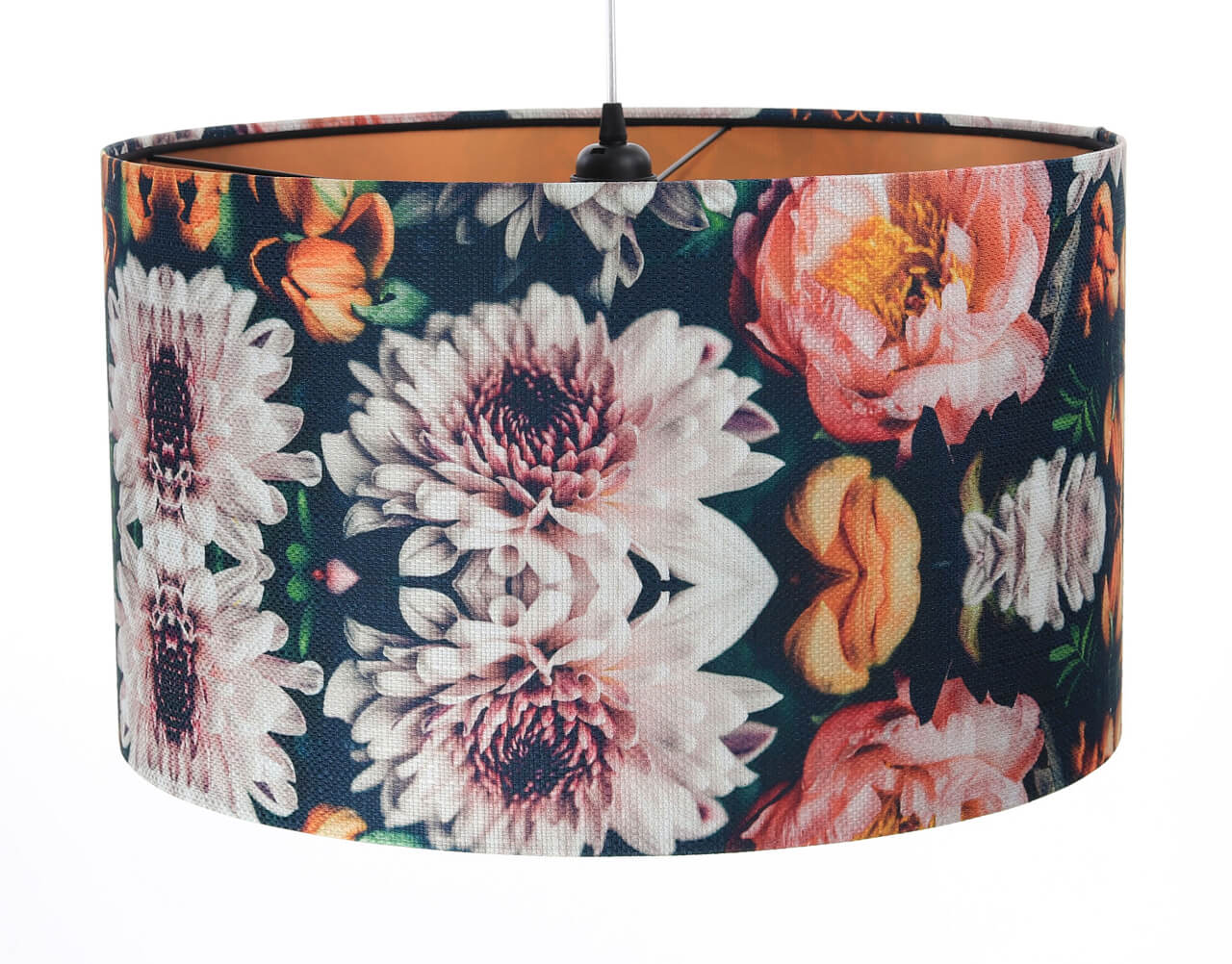 Lampa wisząca z walcowym abażurem ze strukturalnej tkaniny w kolorowe kwiaty, z miedzianym wnętrzem PORTLAND