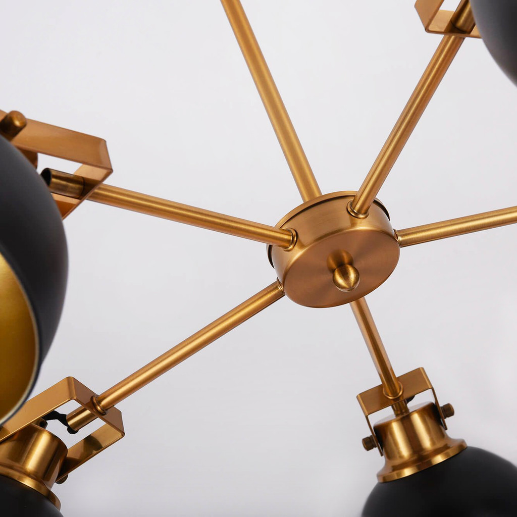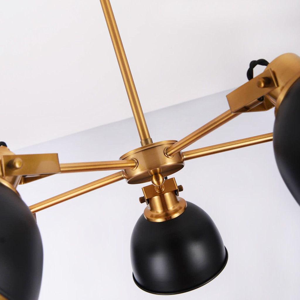 Metalowa, pięcioramienna lampa wisząca BELMONTI W5 wykończona w dwóch kolorach: czarnym i złotym. Klosze posiadają kształt kopuły. Idealnie pasuje do wnętrz loftowych, industrialnych. Nadaje się do salonu, jadalni oraz lokali urządzonych zarówno w nowoczesnym stylu, jak i w stylistyce retro.