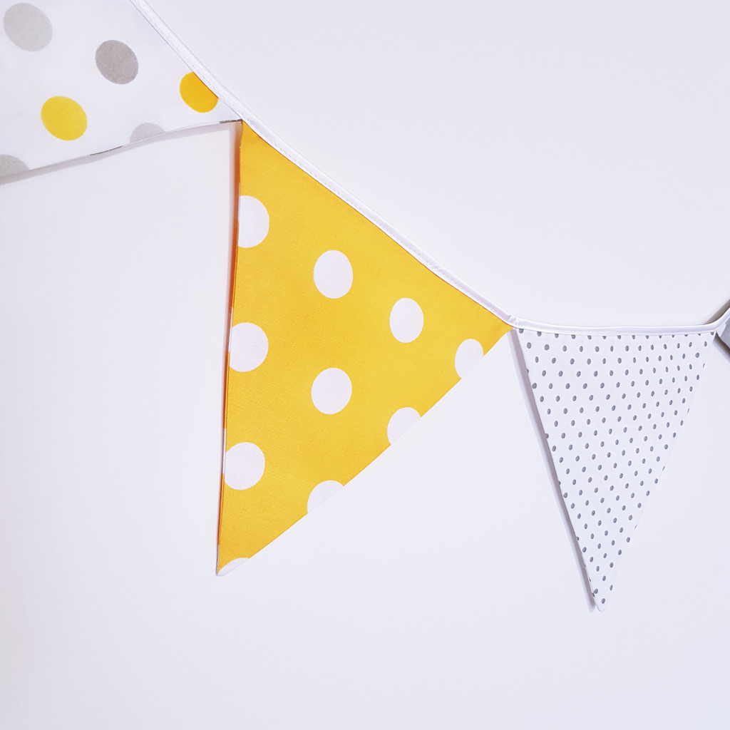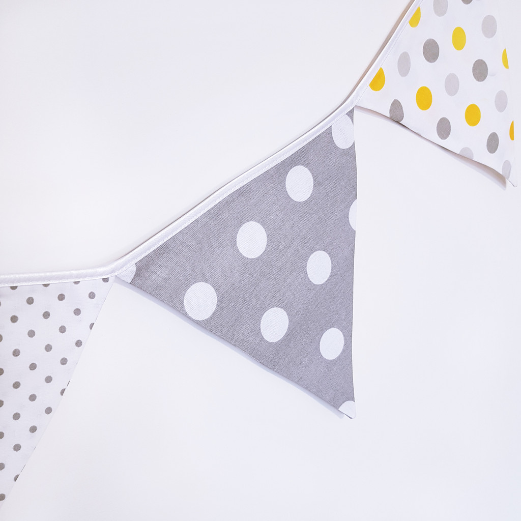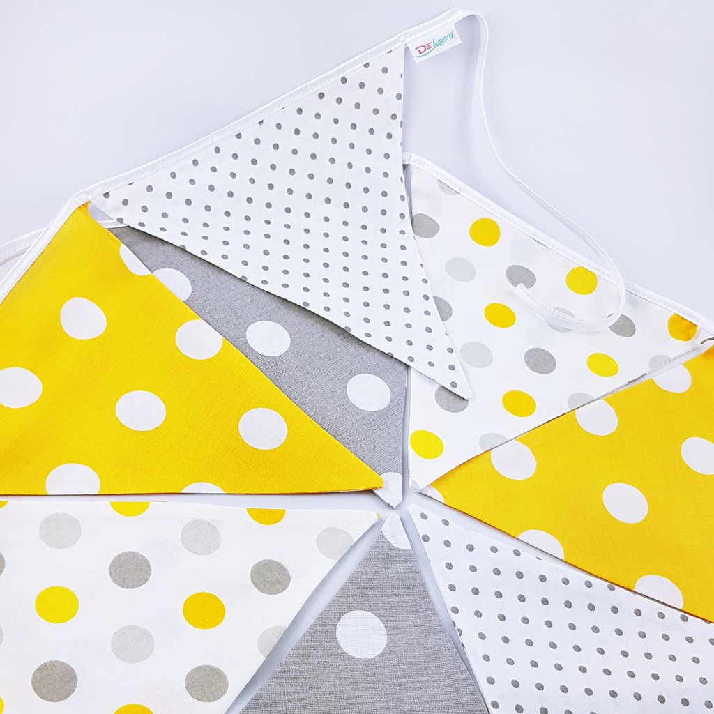 Materiałowa girlanda szaro-żółta w kropki, groszki, grochy
