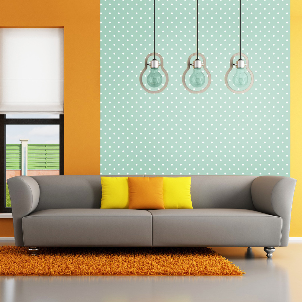 Klasyczna miętowa tapeta w nieduże białe kropki, groszki. Tapeta w kolorze mięty reprezentująca styl polka dot retro vintage.