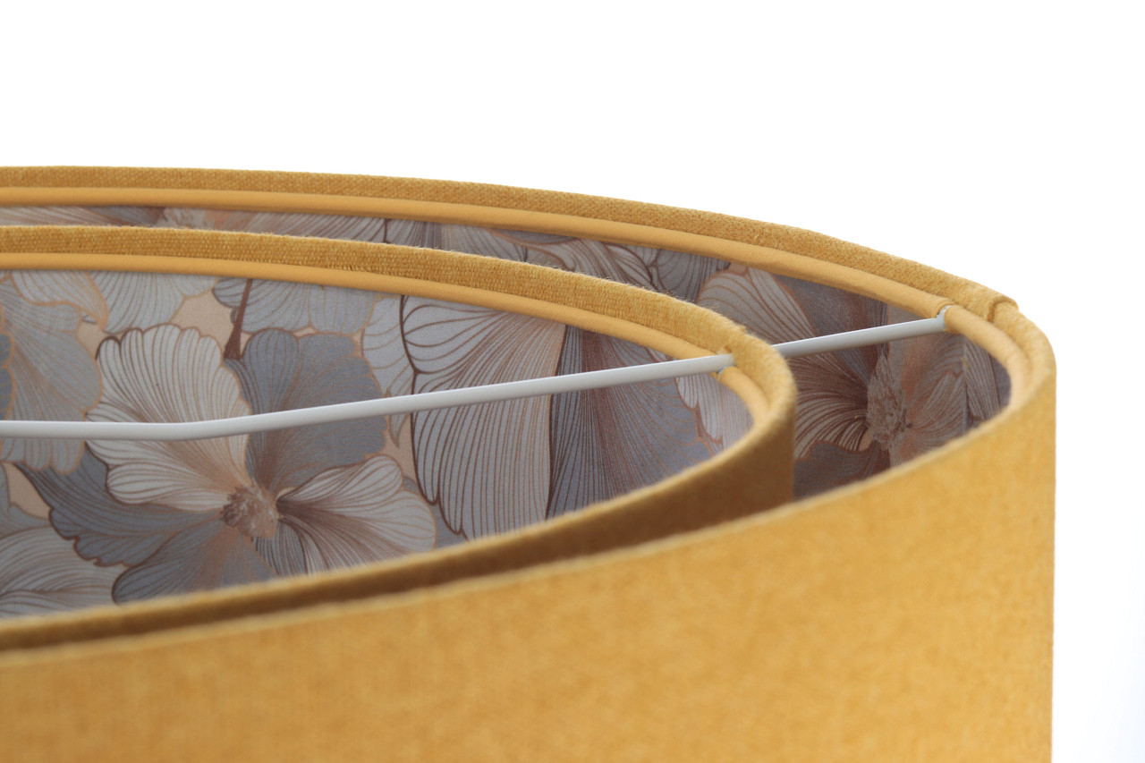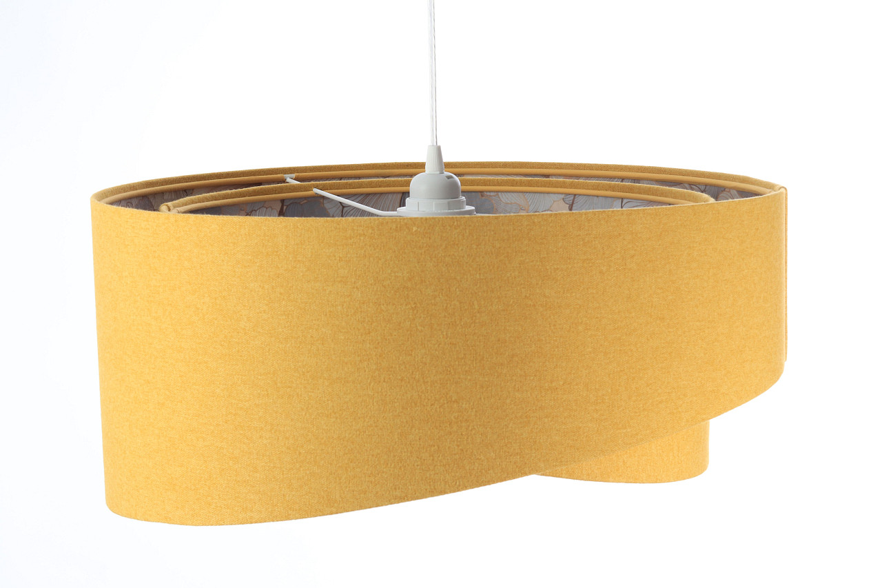 Musztardowa lampa sufitowa z wnętrzem w odcieniach szarości jest wykonana z tkanin najwyższej jakości, zarówno zewnętrzna jak i wewnętrzna strona abażura. Tkaniny nakładane są na specjalną błonę, a całość jest skrupulatnie wykończona elegancką lamówką.