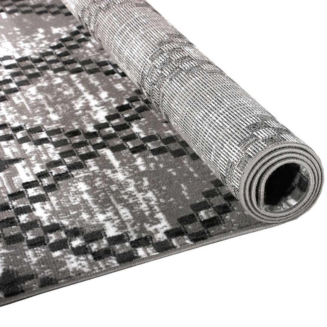 Ten uniwersalny dywan to połączenie stonowanych szarości z ponadczasowym, geometrycznym wzorem, który na pewno zostanie doceniony przez poszukiwaczy niebanalnych dekoracji do domu. Charakteryzuje się on krótkim i przyjemnym w dotyku runem, które bezproblemowo poddaje się zabiegom czyszczącym, nie wchłania wilgoci i jest bezpieczne dla alergików.