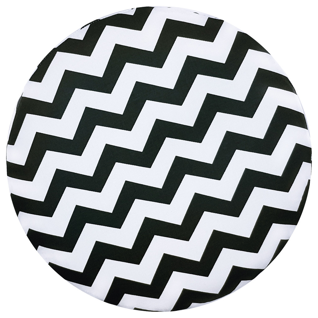 Modny puf w stylu skandynawskim z siedziskiem w biało-czarne zygzaki.