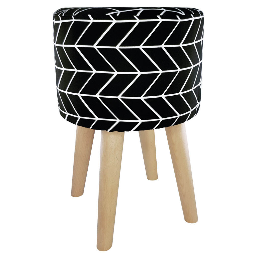 Modny puf do siedzenia w nowoczesnym stylu ze zdejmowanym pokrowcem ze wzorem w czarno-białą jodełkę.