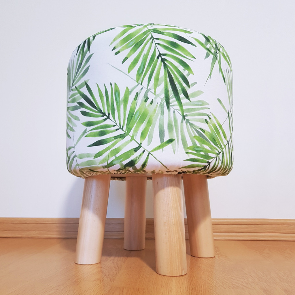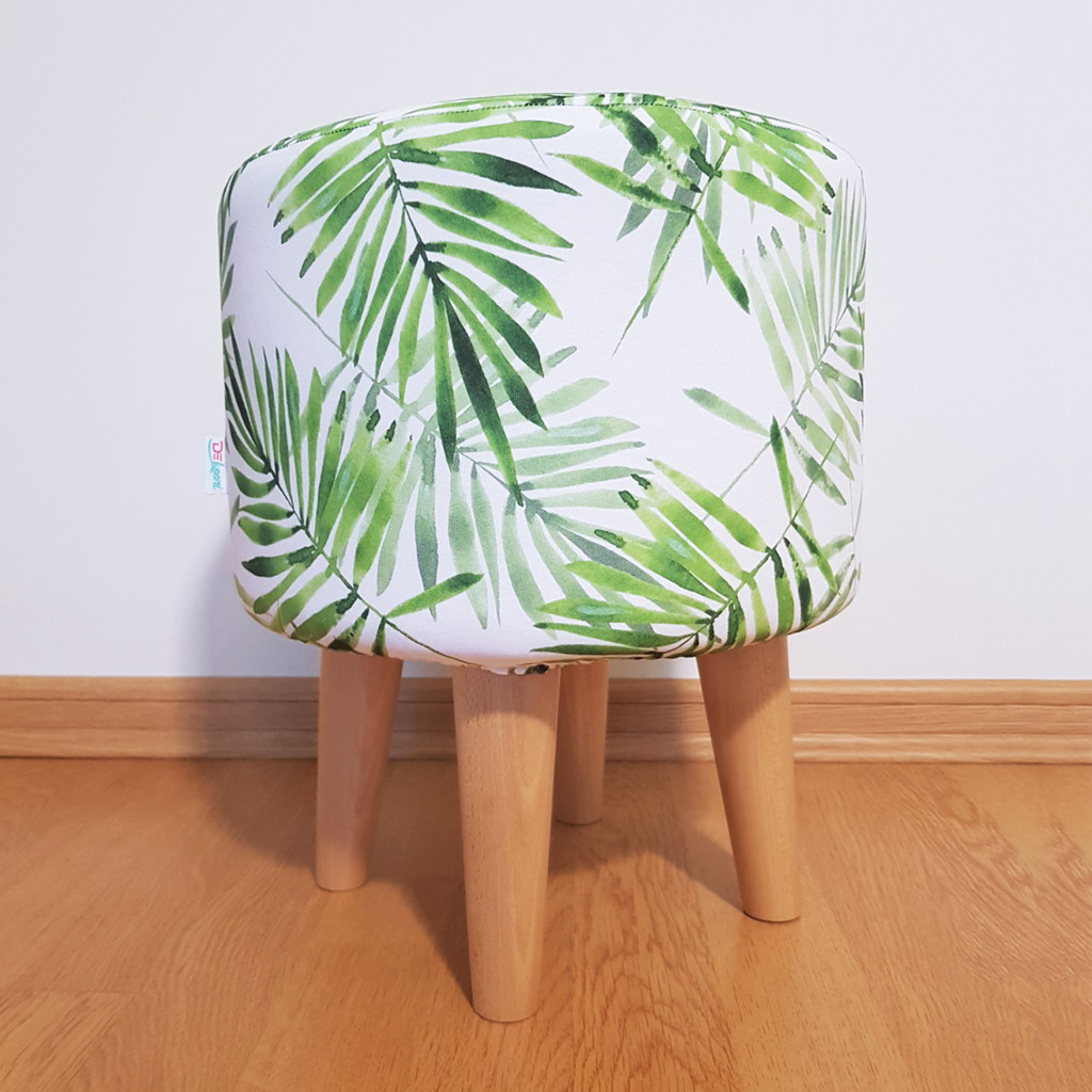 Modny stołek, puf skandynawski w zielone LIŚCIE PAPROCI roślinny design