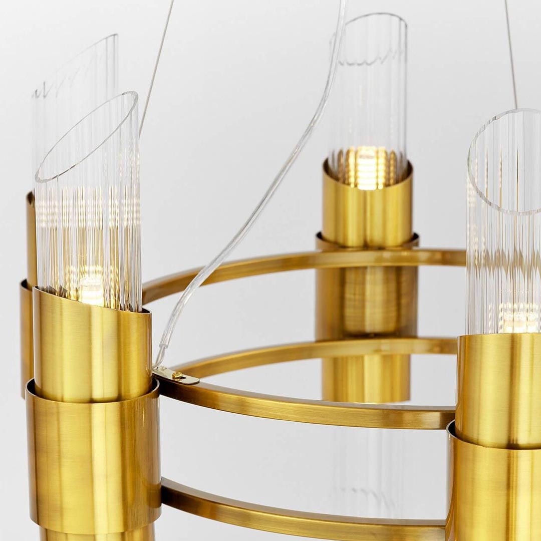 Ten nowoczesny mosiężny żyrandol będzie niezwykle elegancką i stylową oprawą oświetleniową, która łączy w sobie tradycyjny charakter mosiądzu z nowoczesnymi liniami i ciekawymi kształtami. Szklane przezroczyste klosze dodatkowo ozdabiają ryflowania. Lampa ta obsługuje energooszczędne żarówki, które zapewniają równomierne, przyjemne światło, jednocześnie zmniejszając koszty energii i pozytywniej wpływają na środowisko.