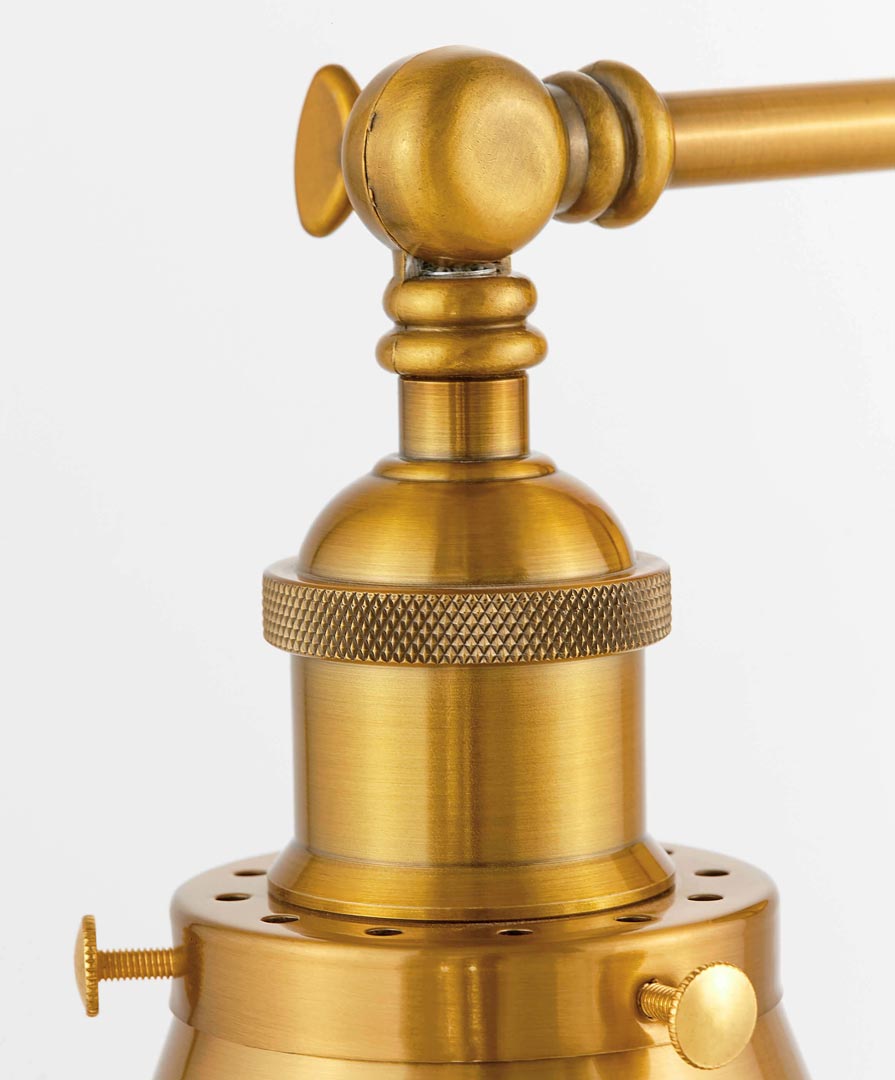 Piękny kinkiet loftowy GUBI W1 w kolorze złotego mosiądzu. Pasuje do stylu retro, vintage oraz nowoczesnych wnętrz industrialnych. Ta lampa ścienna posiada efektowny, metalowy klosz oraz ozdobne śruby.
